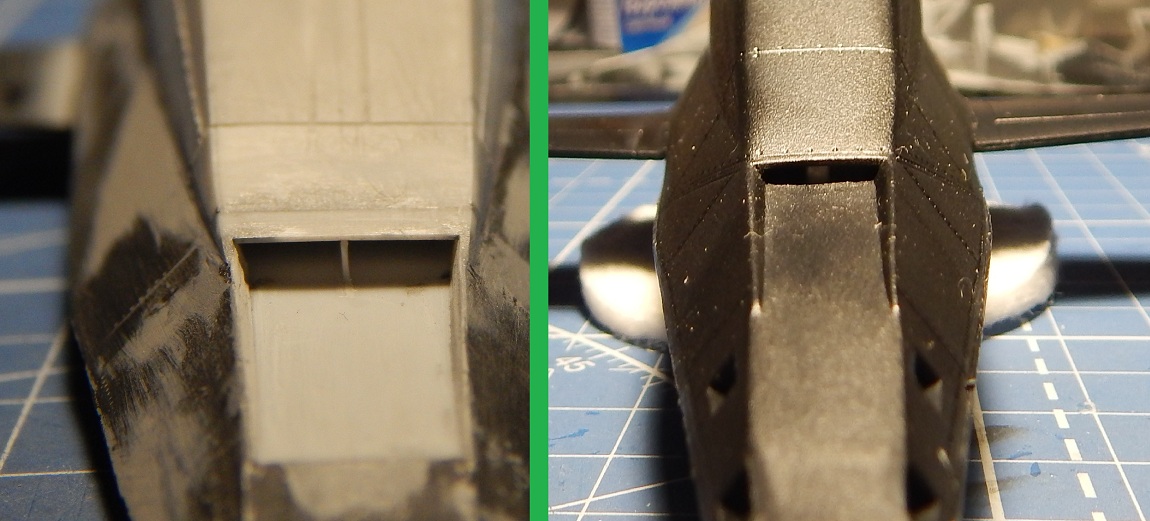 Но после установки ниш всплыла другая проблема с которой я пока не как не справлюсь - наклон боковых частей фюзеляжа под крыльям и под кабиной пилотов не совпадали по прямой с углами и геометрией ниш, в результате чего обточил деталь фюзеляжа, и нарастил пластиком толщиной в 0,25мм, плюс куча шпаклевки, 3 операции пройдены, думаю через 2 захода, получится вернуть фюзеляжу изначальную форму, хотя под кабиной пилотов и в сторону крыльев, все таки видимо придется сделать новую прямую толщиной в 2-3 мм, но спишим это на то что - "Там установлена дополнительная броня, повышающая живучесть машины".