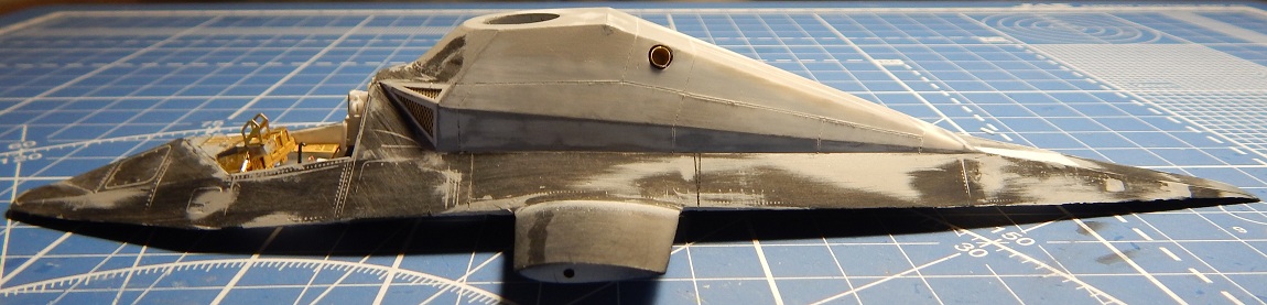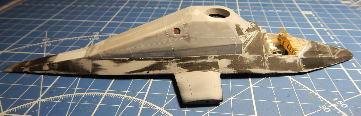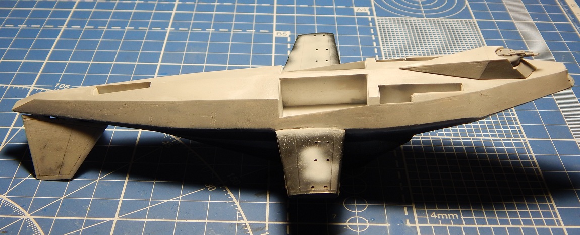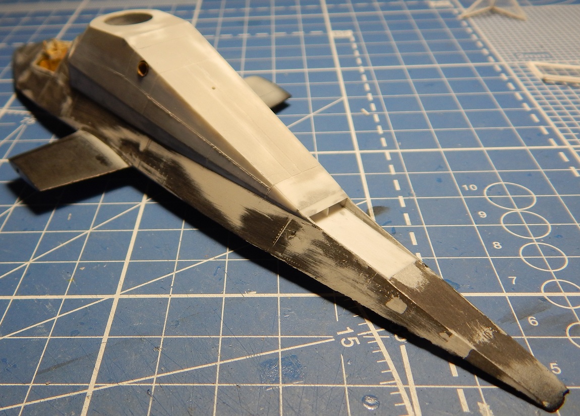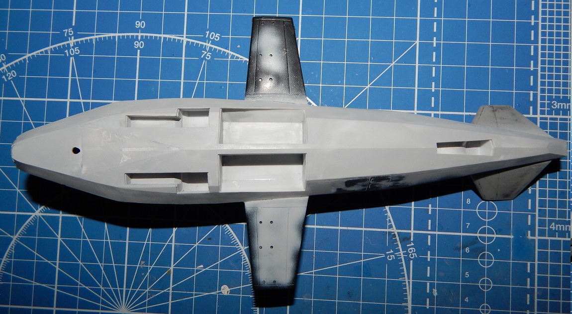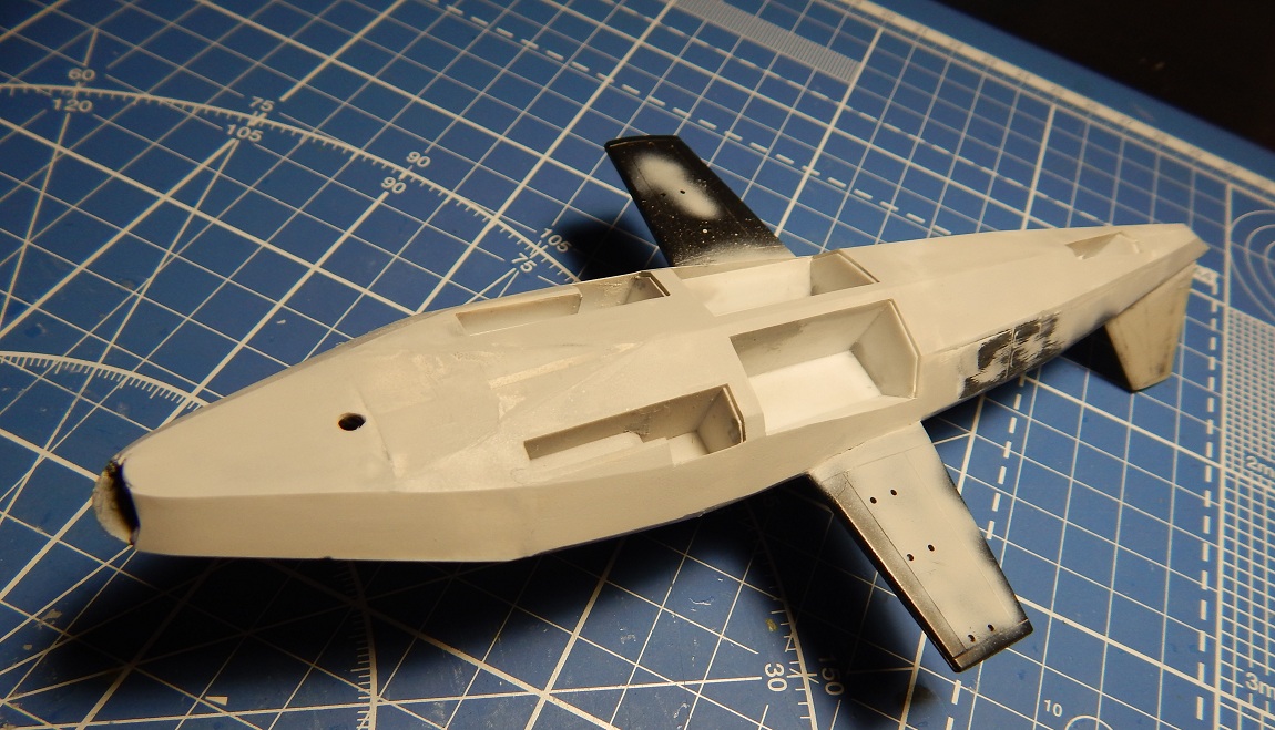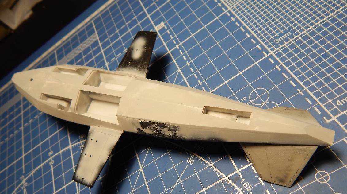 Осталось изготовить фонарь кабины и прогрунтовать фюзеляж, что бы найти недочеты, неровности, царапины, и не исправленные углы (линии).