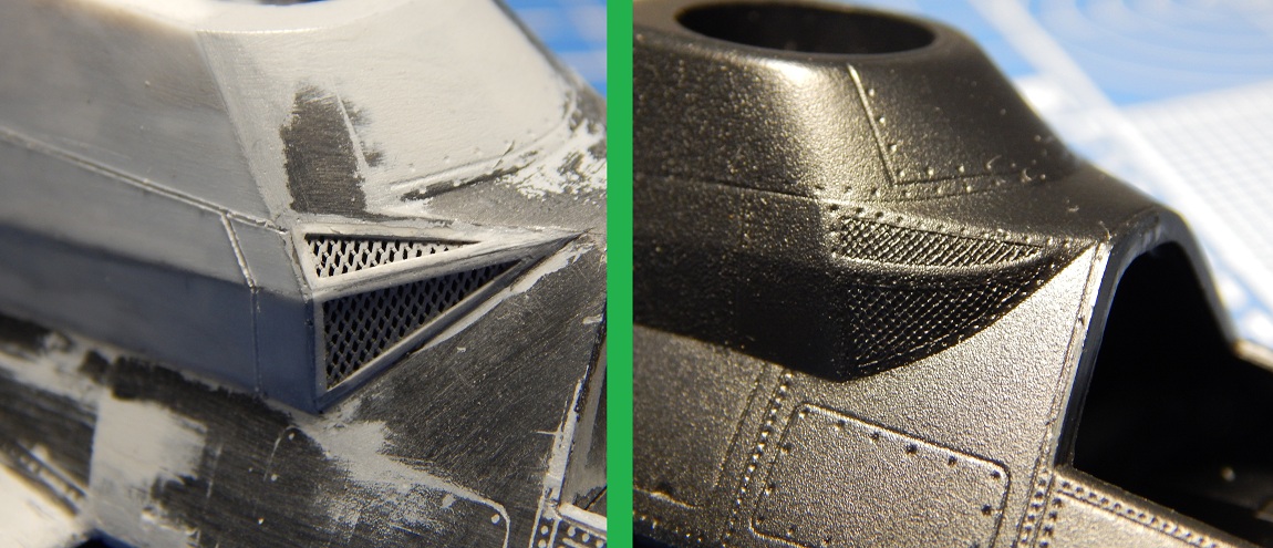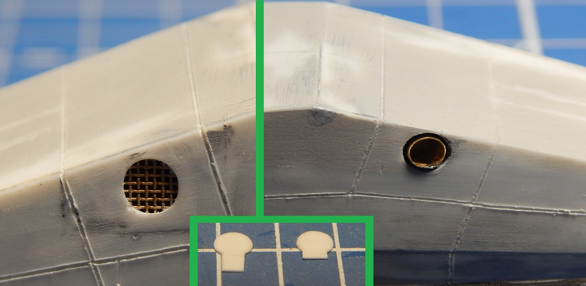 - Заново изготовил и установил воздухозаборники, предварительно изогнув их под новую геометрию фюзеляжа. Сетка от АСЕ, окантовка из пластика от Эвергрина толщиной 0,13 мм.
