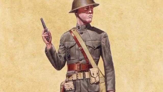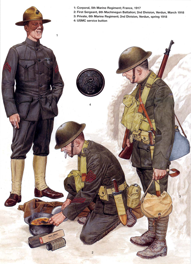Состав полевого обмундирования солдата армии США,либо КМП, или, как их прозвали doughboys, на тот период входило- китель и галифе из сукна защитного цвета, со стоячим воротником, на котором имелись петлицы. На кителе имелись наружные карманы с клапаном, по два на груди и в нижней его части. В галифе два брючных кармана на бедрах. Ботинки, с низким берцем и обмотки. Офицерский состав, вместо обмоток, носил гетры. Поверх кителя, по верхнему срезу нижних клапанов одевался поясной ремень. Под кителем носилась рубашка с отворотным воротником. В составе демисезонного и зимнего обмундирования входили полупальто и однобортная шинель из плотного сукна соответственно.На руках пятипалые перчатки.