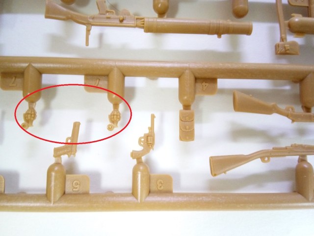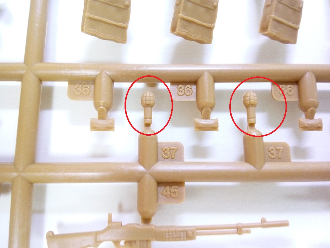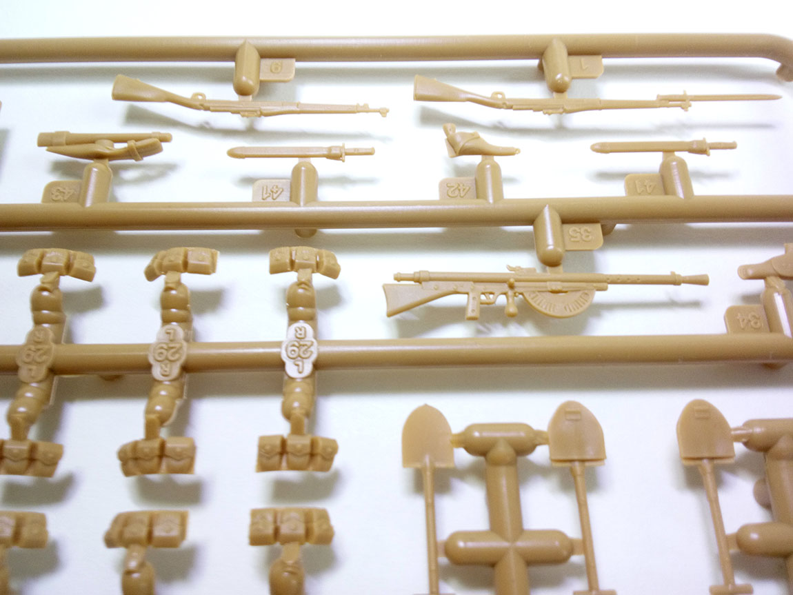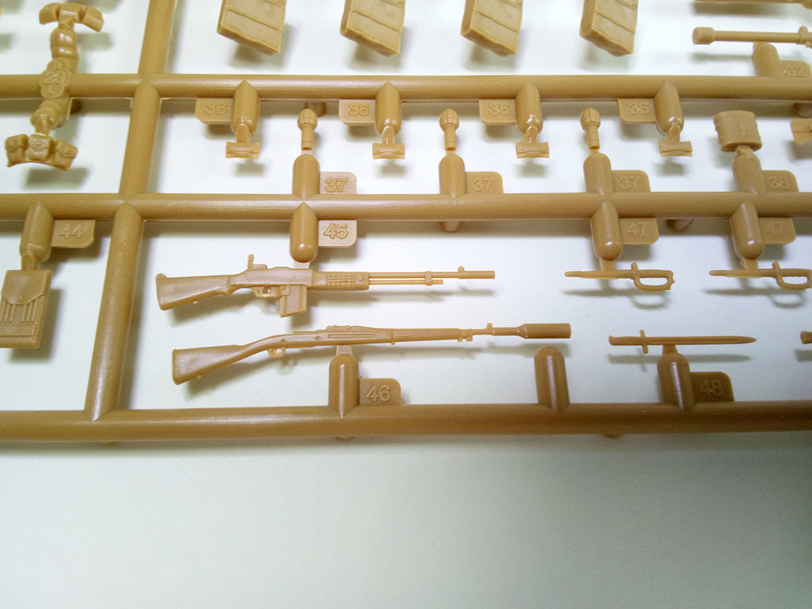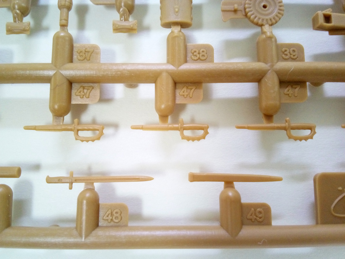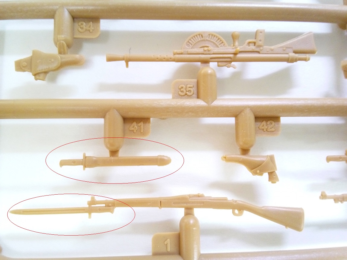На литниках больше всего присутствует винтовок винтовок Спрингфилд 1903А1. Со штыками и без. хочется отметить, что штыки на них образца 1905-го года. Это важно. Также, помимо этого, присутствуют данные штыки отдельно в ножнах и отдельно ножны без штыков, это радует, ибо, вручая бойцу винтовку с примкнутым штыком, хочется, все же, чтоб на ремне у него висели пустые ножны, нежели с вставленным в них "запасным"