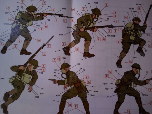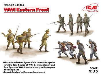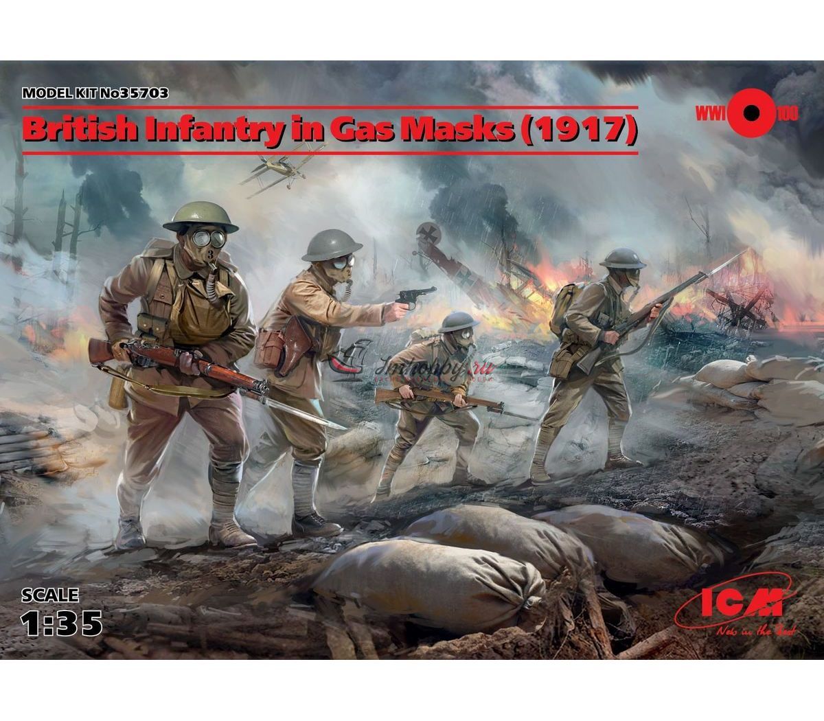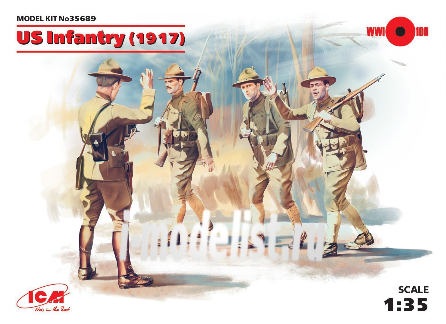 Итак.. Пехота!! А конкретнее- бойцы в газовых масках. Набор замечательный, однако, он, как и многие другие продукты ICM, унифицирован. То есть, данный "лот" практически идентичен другому- "Пехота США 1918 год", который числится за артикульным номером 35693. И оба представлены ниже