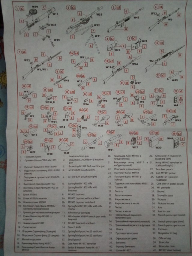 В целом, набор аутентичен. Я, лично, доволен. Дано всё необходимое, и даже чуть больше. Как бы то ни было, но стволы у ружейного гранатомета, пулемётов Льюиса, дробовиков, все же придётся высверлить, потому что, из-за особенностей литья, иначе нельзя. Один нюанс. При сравнении набора вооружения и литника с оружием у фигур(которые идентичны) , обнаружил, что второй, более новый, и там детали ещё четче проработаны. Добавлены надписи US на кабуры, и появился чехол для компаса.