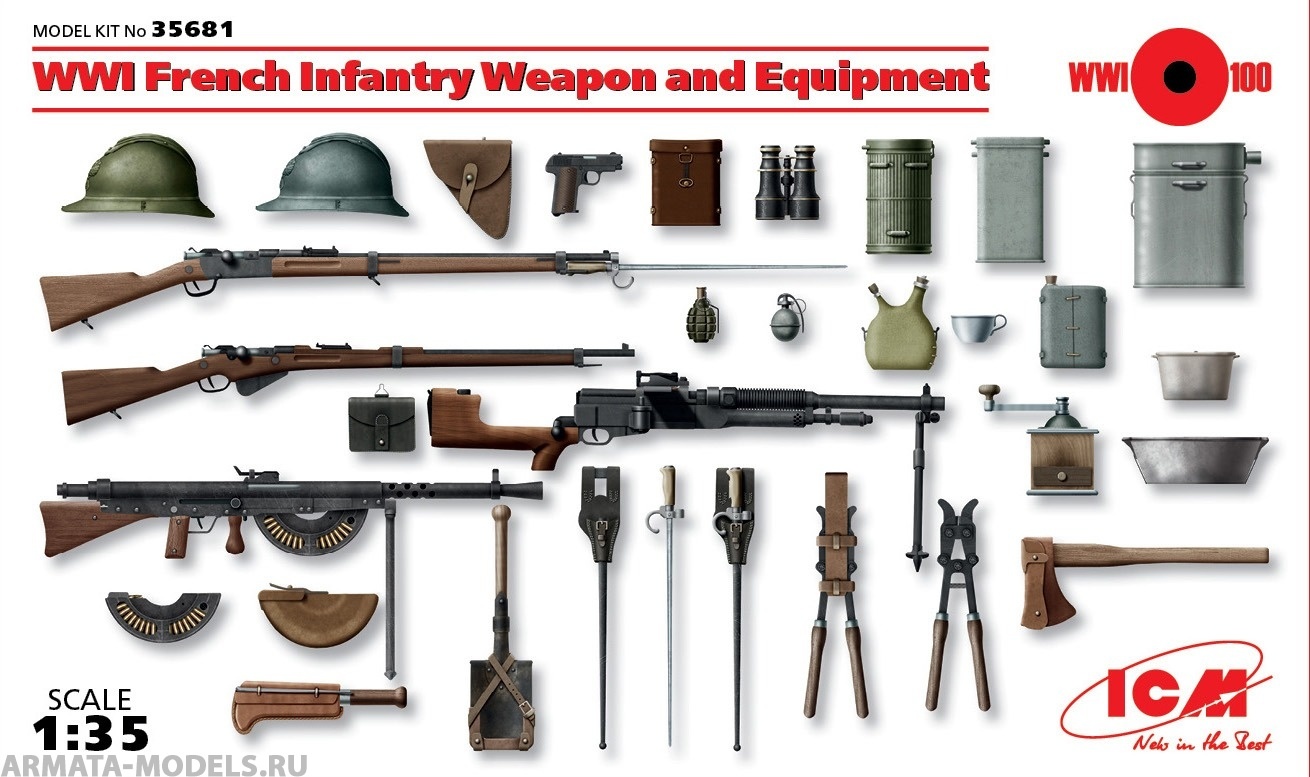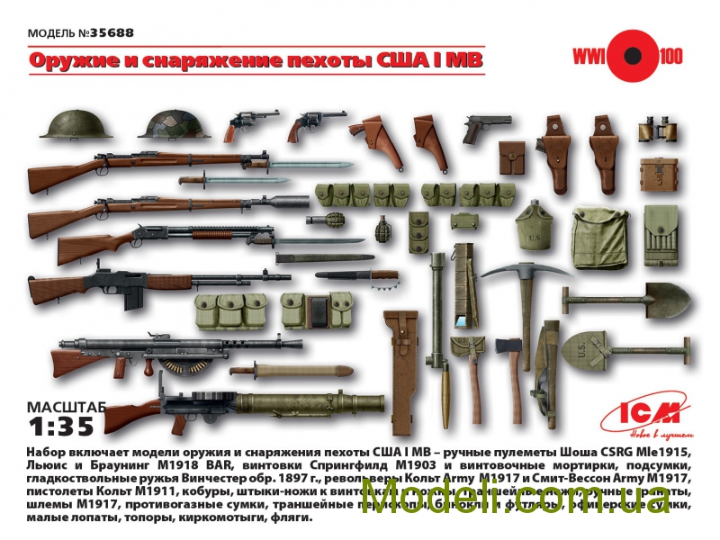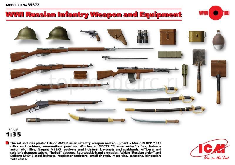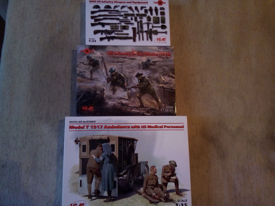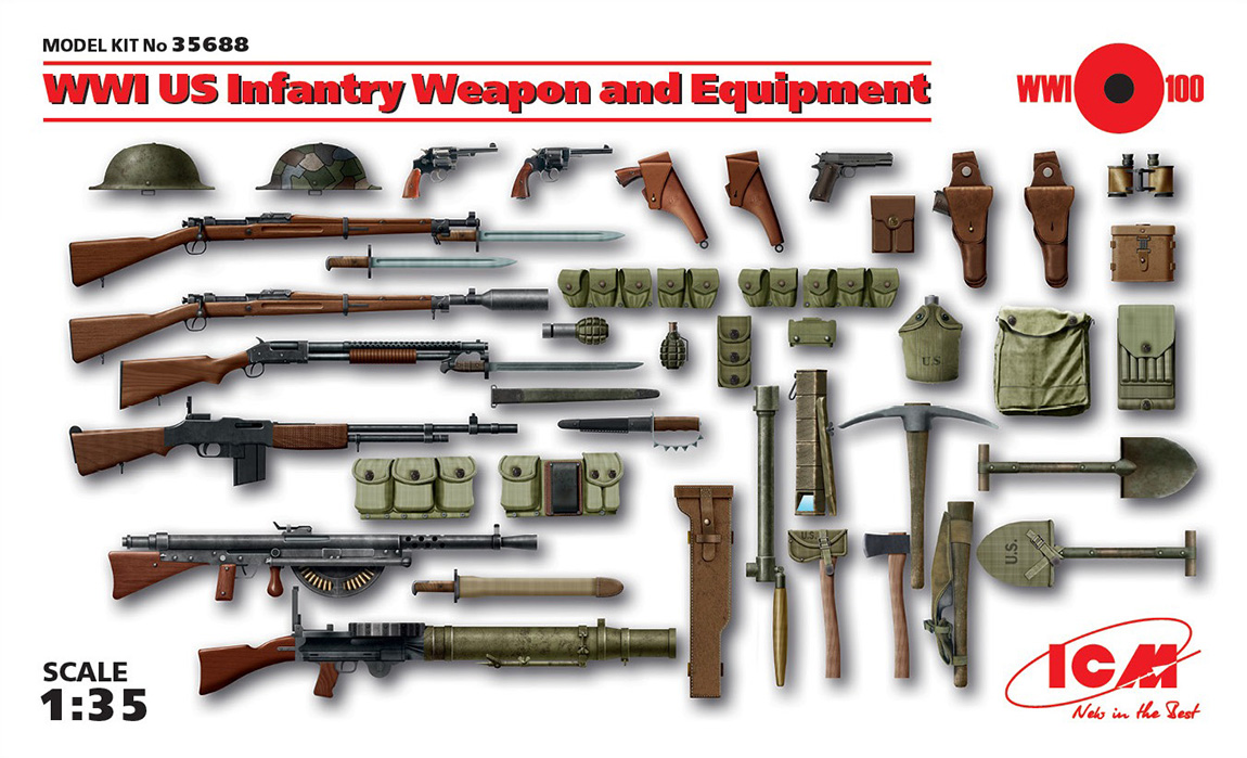 В продолжении, хочу ответить сразу на вопрос, который зададут себе многие-почему именно США, в названии темы. А потому, как в сети, в частности, очень мало внятной информации по участию США в первой мировой. Еще меньше эта тема освещена в моделизме. На данный момент, что касаемо миниатюры, то мы имеем несколько общедоступных фирм, по большей части наших, таких как MB, ICM. Tamya, немного). Все остальное - смола. Танк, Сталинград, Verlinden. А если говорить об ICM, то в последнее время они прям радуют- здесь и наборы вооружения, в том числе США (присутствует даже мой любимый Winchester m 1897 Trench gun). И даже экзотика, в виде итальянцев и турков. Сравнительно недавно анонсировали Марнское такси, наборы по направлениям фронтов (запад-восток). Ну и, конечно же, всем известные старые наборы немецких штурмовиков ( правда без кирас, ПП и огнеметов), и набора томми, которых смело можно замаскировать под агрессивных канадских тренч-рейдеров)). Также присутствуют различные атрибуты той войны- палицы, ножи-кастеты, кирки-мотыги и.т.д. Отдельно хочется отметить наборы вооружения. В частности, присутствуют такие образцы, как винтовки Лебеля, Бенет-Мертье, пулеметы Гочкисса обр. 1909 года, и пулемет Шоша, правда французский вариант. Мадсен, автомат Федорова. В смоле, если честно, я такого не встречал. Однако, возвращаясь к теме миниатюр..то фирма "Танк" выпускает довольно-таки обширную номенклатуру фигур, в частности РИА. У меня даже, однажды, всплыла идея запилить атаку мертвецов, ту, что в Крепости Осовец произошла, там хватает фигурок наших. С некоторыми доработками, вполне сойдут для такого сюжета.