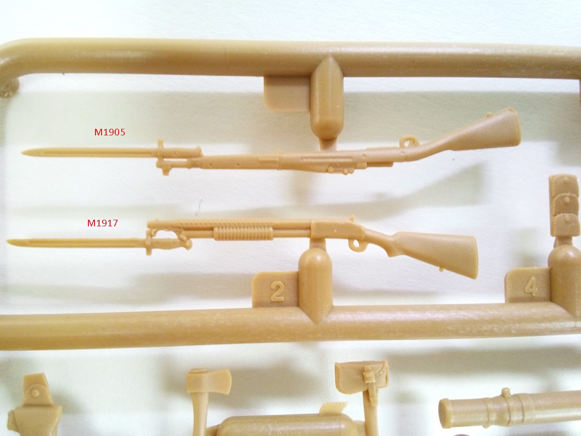 Теперь по винтовкам.. Сразу вызывает подозрение наствольный гранатомёт на спрингфилде, в наборе от ICM. Насколько я владею информацией, такие вещи у штатов только во 2 мировую появились. В ПМВ использовали винтовку Спрингфилд М1903А1, почему не просто М1903- потому как эти системы были под разный патрон разработаны, а именно: модификация М1903 под патрон .30-03 (патрон 30-го калибра, он же 7,62, с закруглённой пулей образца 1903 года), тогда как А1 уже под патрон .30-06, с остроконечной пулей.