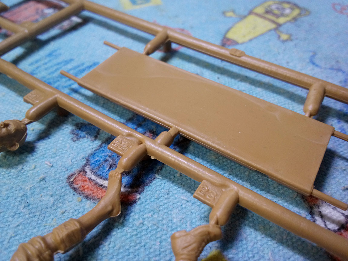 Ладно, с санитаркой, более менее понятно. Теперь фигуры.В наборе один литник с деталями фигур. Присутствует четыре фигуры- раненый на носилках, раненый, своим ходом загружаемый в санитарку, медсестра и корпсмэн (санитар). По качеству их исполнения, помимо присутствия незначительных литьевых швов, хочется сказать следующее: позы живые (хотя, видел "спецов", которые из дорогих смоляных фигур исполняли каких-то ДЦП-шников в абсолютно нереальных положениях, как манекены в общем, всё зависит от подгонки при сборке).Лица не замылены, и, в случае с медсестрой, даже переданы женственные черты (что обещает получить на выходе, все же, женщину, а не, извините за выражение- трансвистита, с брутальными чертами лица и скул