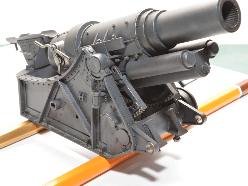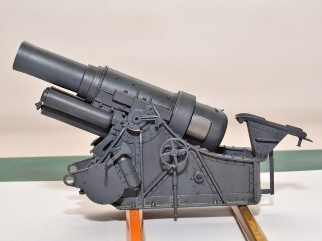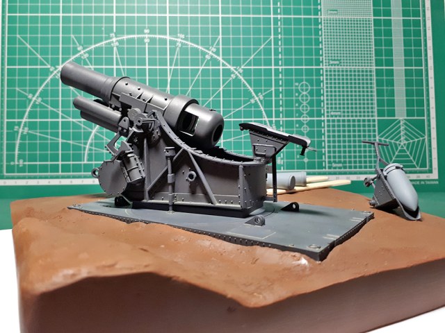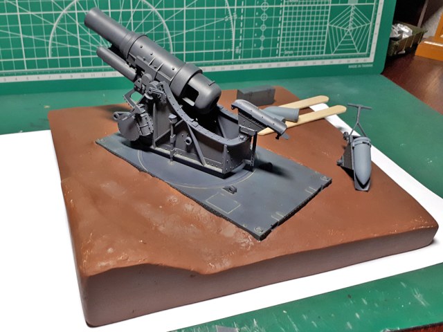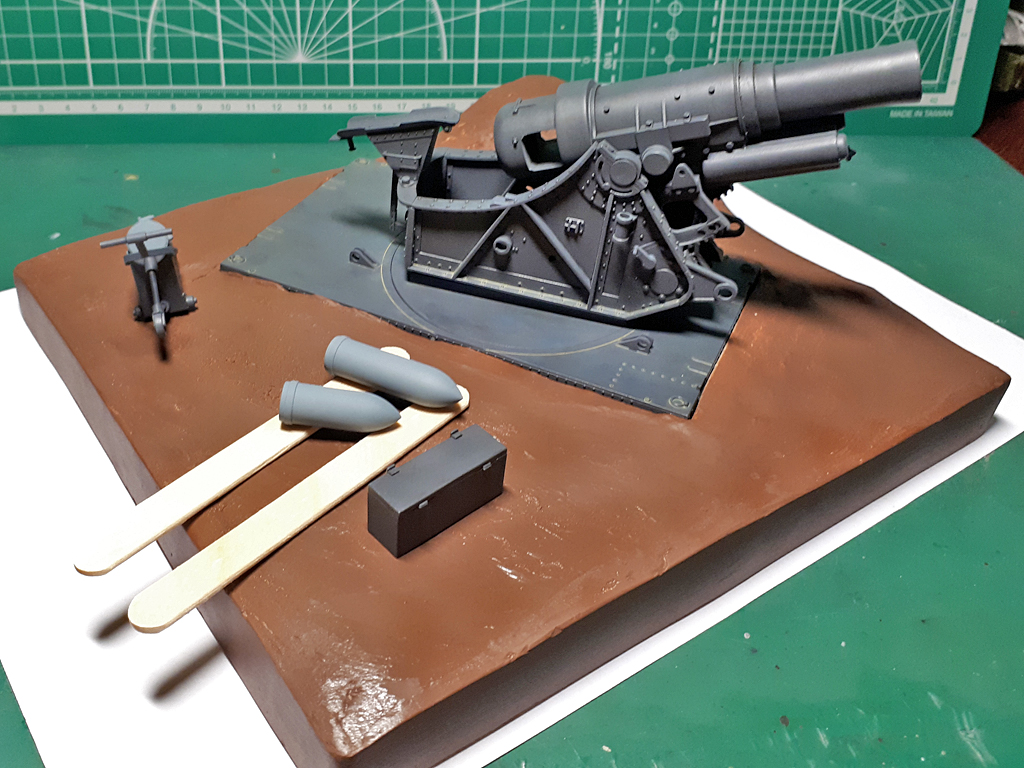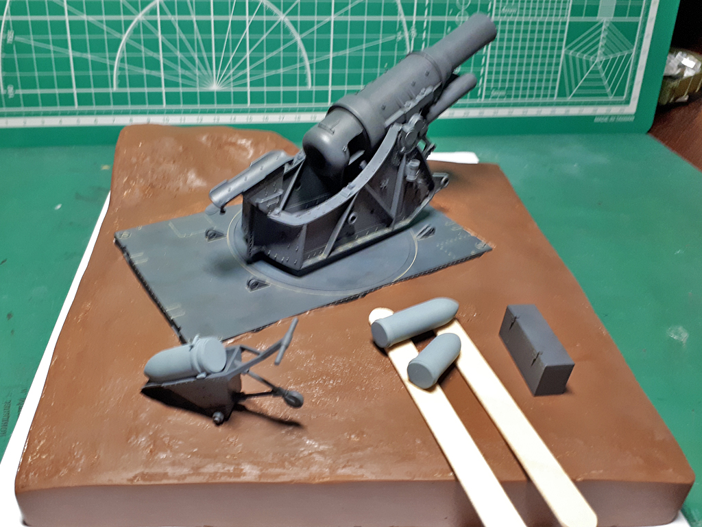 При постройке диорамы обратите внимание на то, что платформа должна обязательно быть вкопана. На фото рядом с орудием часто куча земли, выработка от копки котлована. Выкладку конечно можно сделать, но для заряжания надо водрузить снаряд на тележку или положить непосредственно на лоток. Это на минуточку без малого 300 кг. На паре фото встречал ручные носилки, но тогда надо дугообразный кран (в боевых условиях очень редко на фото) и выкладку с правой стороны. Т.е. в вашем варианте в качестве выкладки логично будут смотреться пороховые заряды и картузы. Не забудьте про палку досылатель, без нее орудие не зарядить. И орудовало ею человек 6.