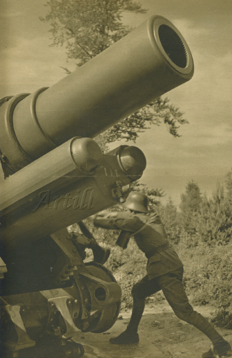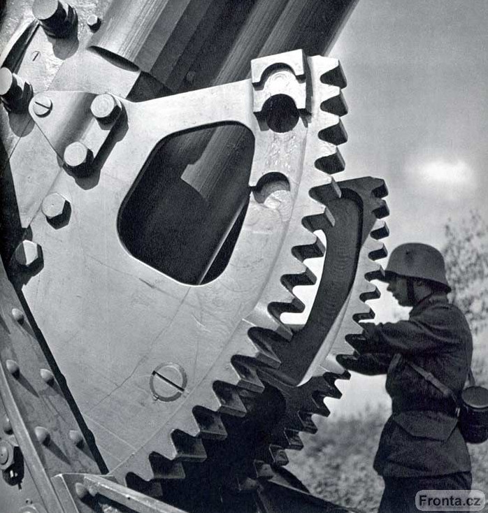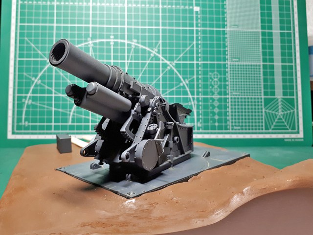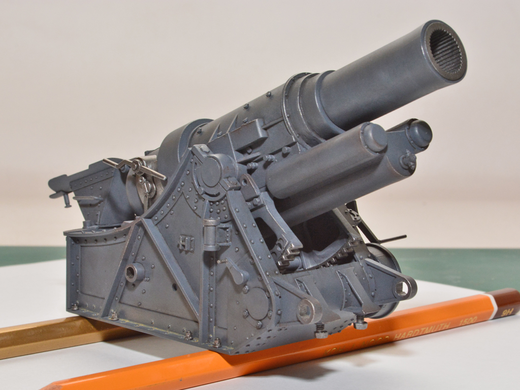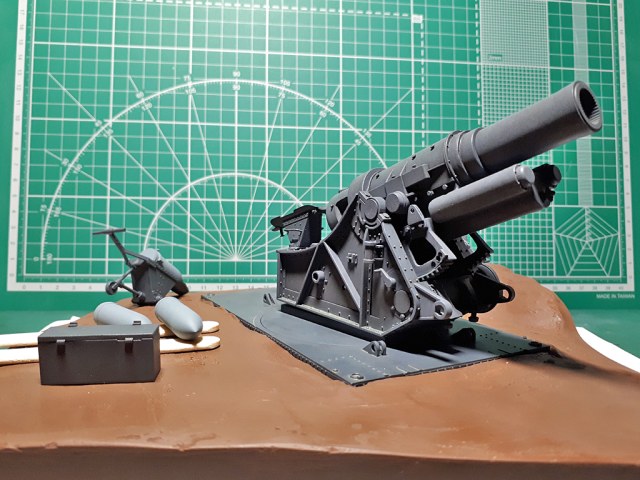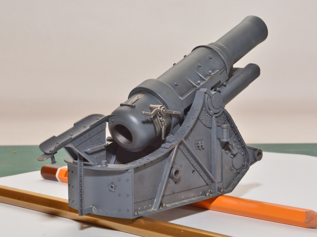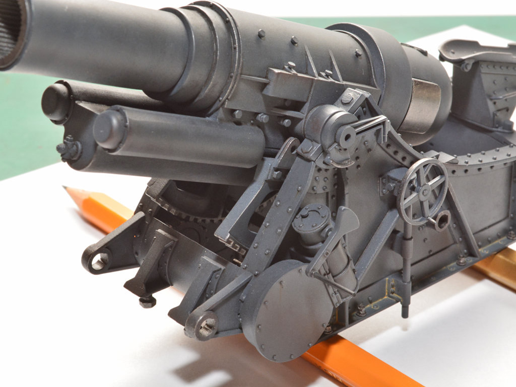 При постройке диорамы обратите внимание на то, что платформа должна обязательно быть вкопана. На фото рядом с орудием часто куча земли, выработка от копки котлована. Выкладку конечно можно сделать, но для заряжания надо водрузить снаряд на тележку или положить непосредственно на лоток. Это на минуточку без малого 300 кг. На паре фото встречал ручные носилки, но тогда надо дугообразный кран (в боевых условиях очень редко на фото) и выкладку с правой стороны. Т.е. в вашем варианте в качестве выкладки логично будут смотреться пороховые заряды и картузы. Не забудьте про палку досылатель, без нее орудие не зарядить. И орудовало ею человек 6.