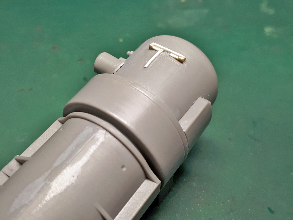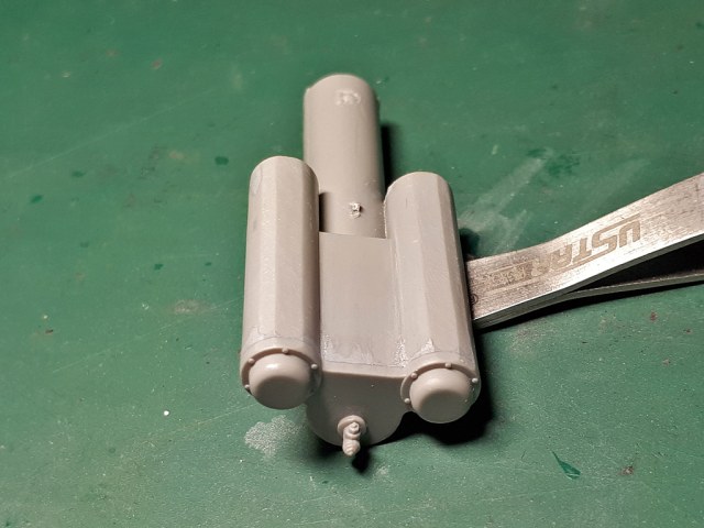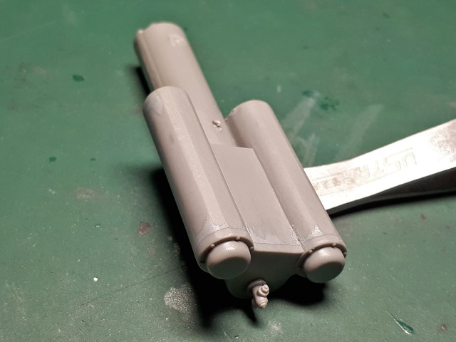 В качестве доработки исходника установил на нижних поверхностях его передних кронштейнов два болта. Их довольно часто можно видеть на фотографиях прототипа, но в наборе они не даны. Масштабных болтов у меня не оказалось, поэтому переточил их из имеющихся винтов.