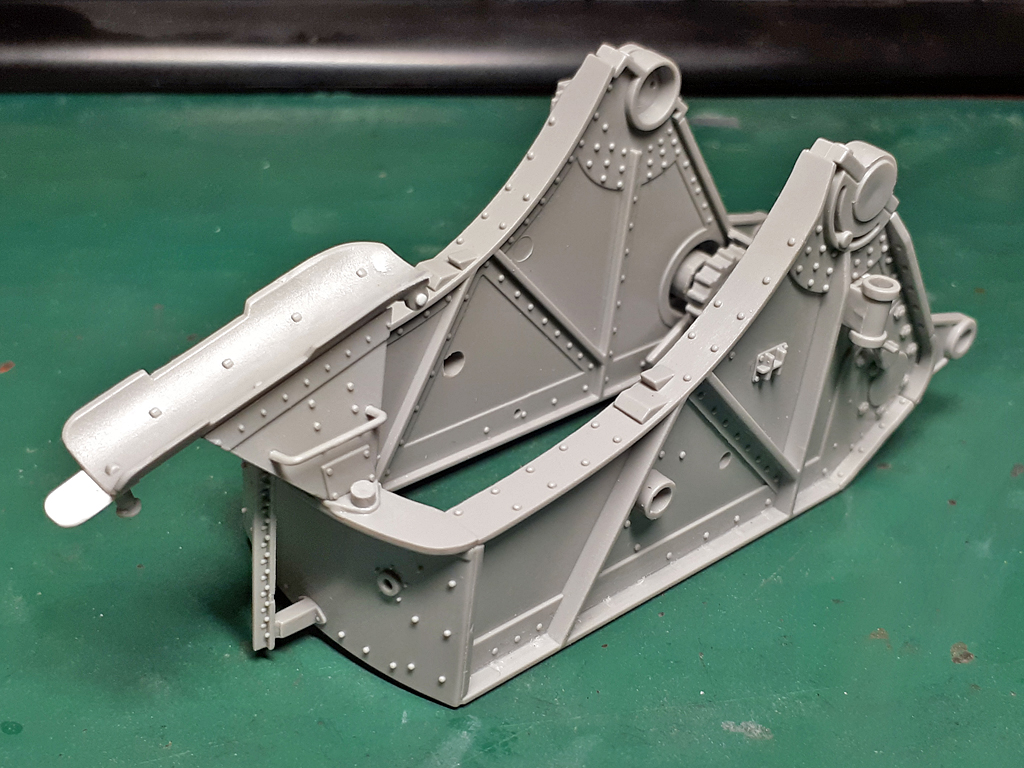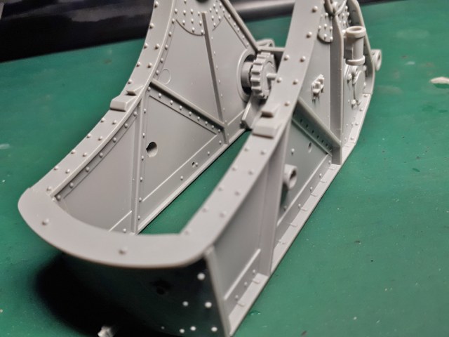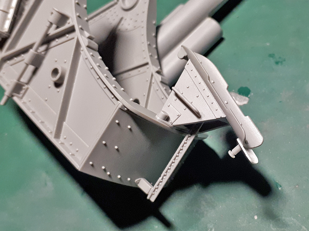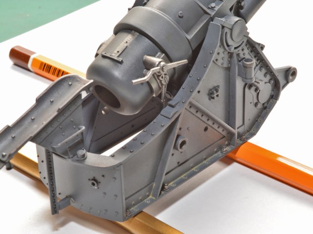 Для придания большего реализма также стоило-бы переклепать нижний обод лафета (там, где он крепится к поворотному основанию), т.к. вместо заклепок производитель там дает некие "палочки". Но масштабных заклепок у меня сейчас нет. Поэтому, если до стадии окраски я их смогу достать, то "переклепаю". Иначе, оставлю как есть.