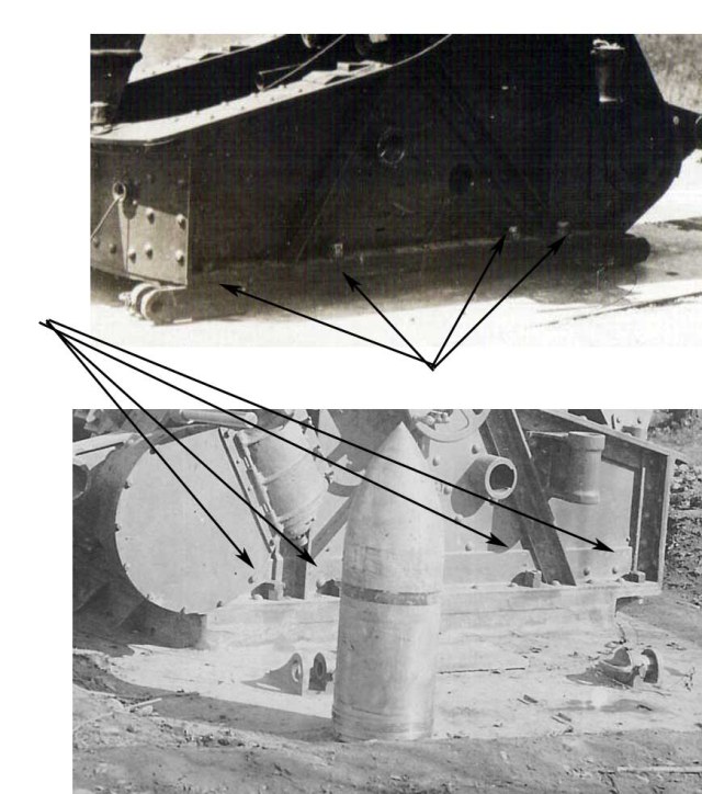 Здесь необходимо сказать, что вообще у данного орудия было два типа платформы. Наиболее заметными их отличиями (по крайней мере для меня) являются разное расположение и форма 4-х проушин на верхней части платформы, а также глубина приямка для отката ствола. Судя по фотографиям из сети, в варианте который дает "Таком" (проушины на неподвижной части платформы) приямок не глубокий, в отличии от другого варианта с проушинами на поворотной части платформы.