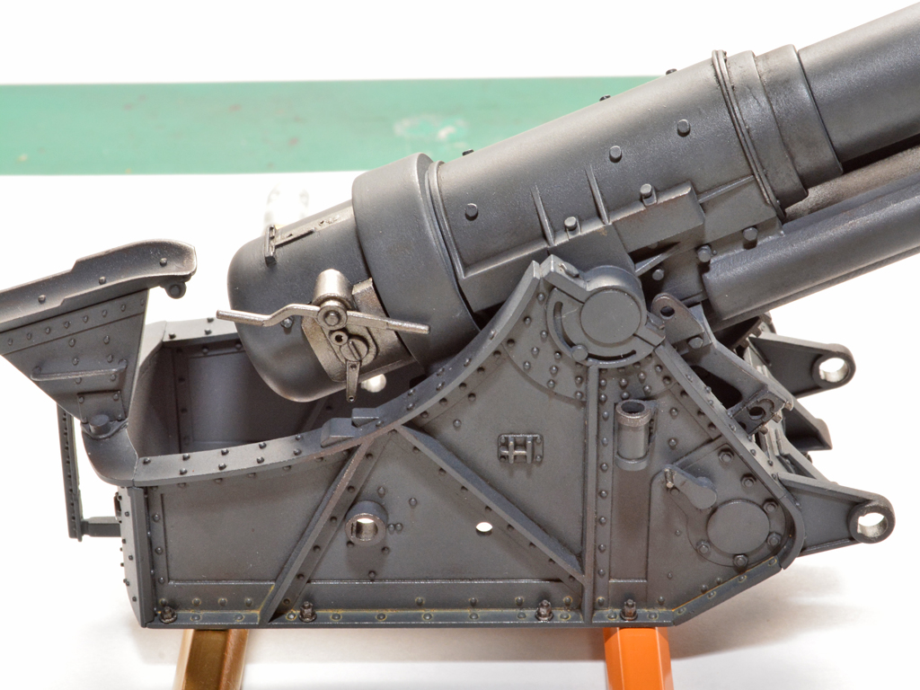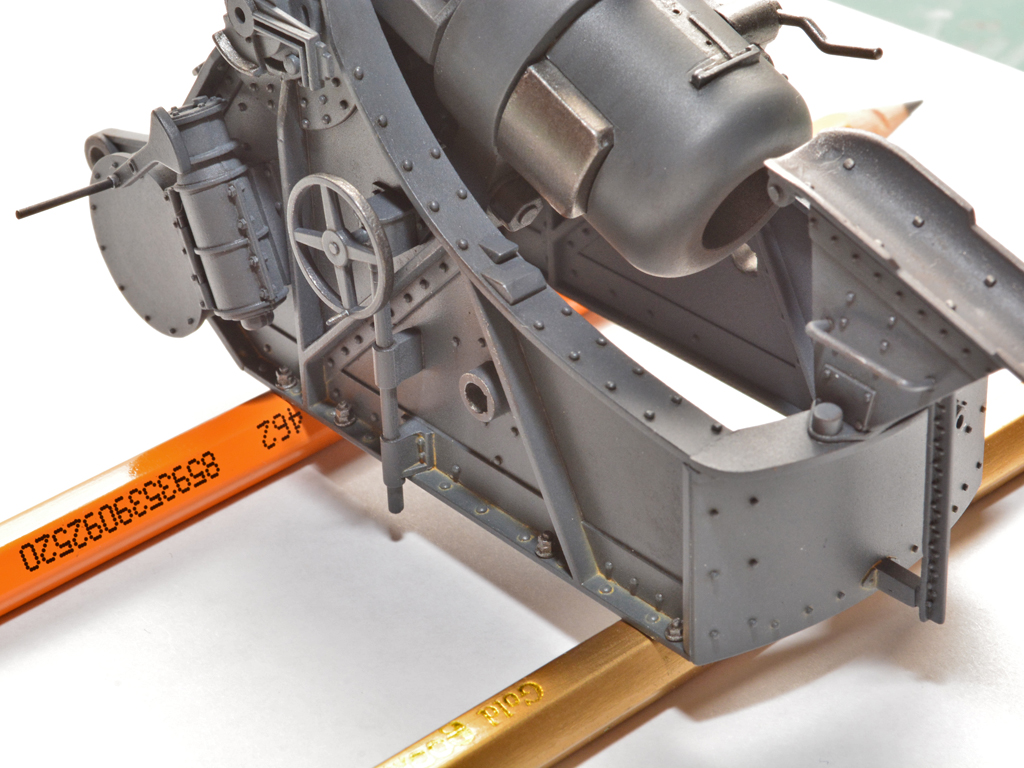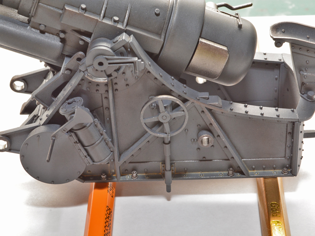 Для придания большего реализма также стоило-бы переклепать нижний обод лафета (там, где он крепится к поворотному основанию), т.к. вместо заклепок производитель там дает некие "палочки". Но масштабных заклепок у меня сейчас нет.