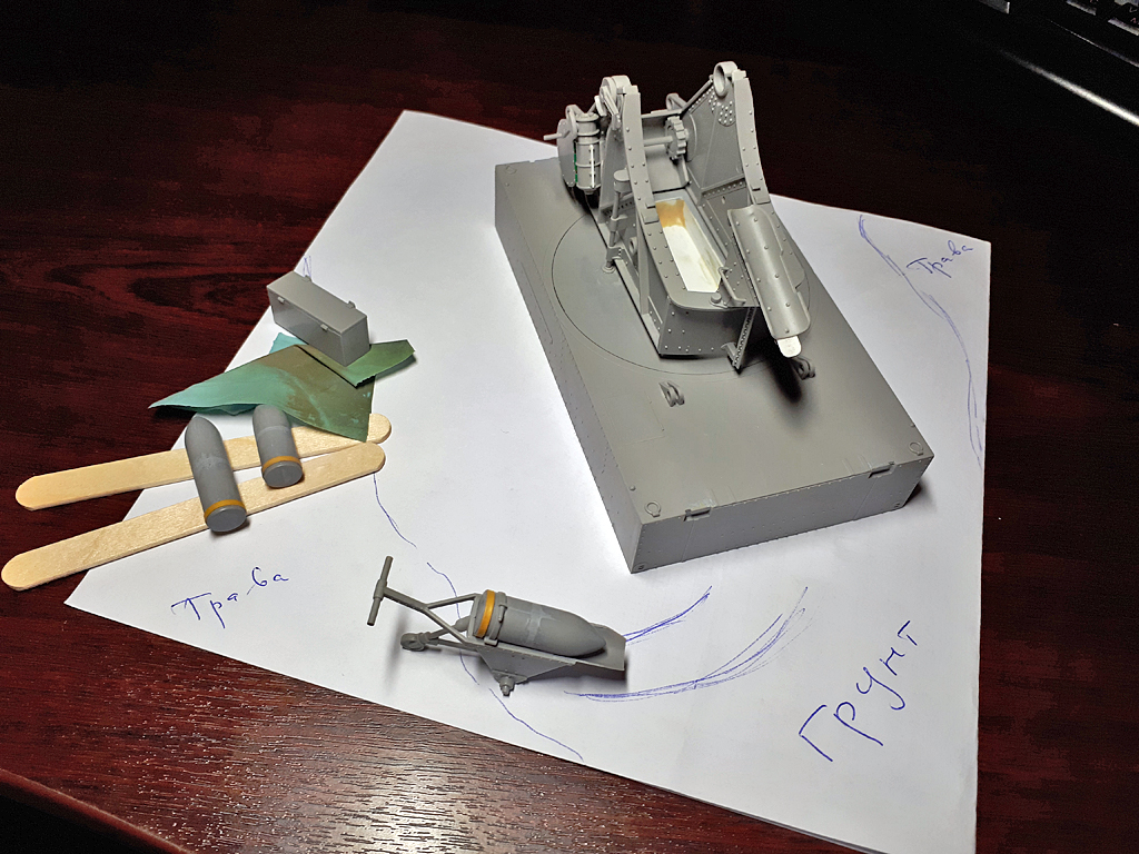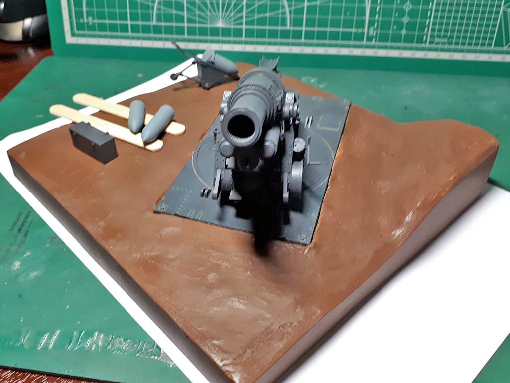 Про кучу земли из котлована сбоку и стойки для доп.оборудования тоже думал. Но так как делать я буду небольшую виньетку, то боюсь, что они сильно перегрузят композицию. Планировал просто "бросить" прибойник-досылатель рядом с орудием на землю.