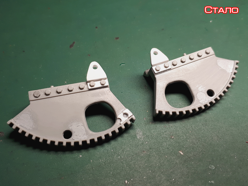 1. Смастерил проушины на зубчатых секторах подъема ствола, а также на правом из них - элемент, который как мне кажется выполняет роль фиксатора люльки в транспортном положении (если не прав, кто знает подскажите что это):