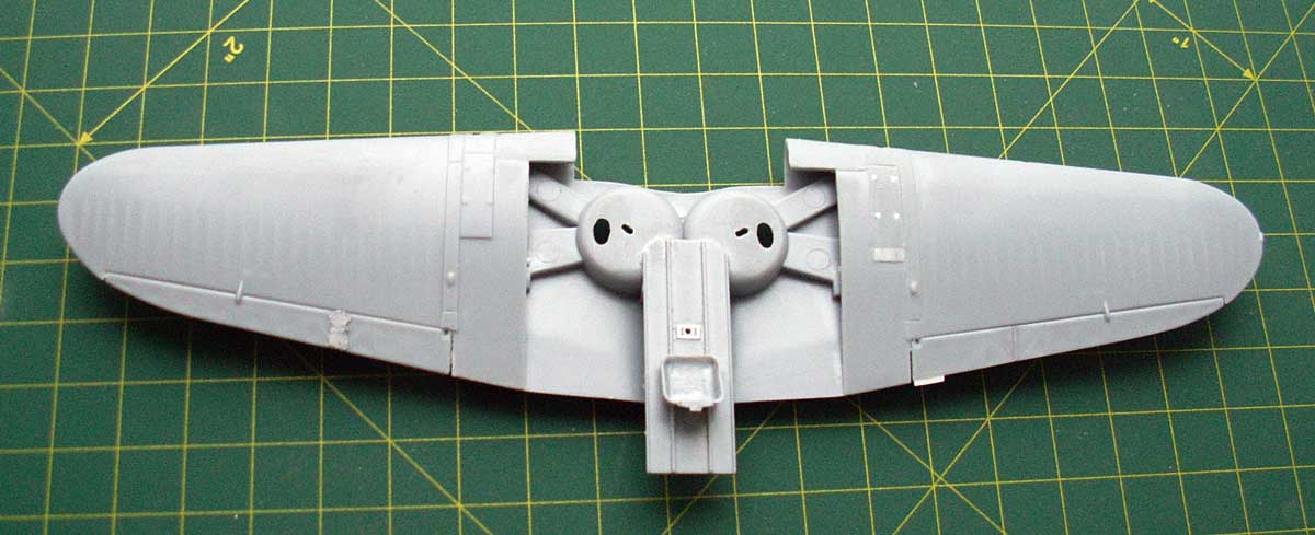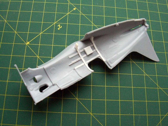 - сделал дырки на месте окон в нишах, в боковой стенке пока не прорезал, на правом крыле гильзовыбрасываетль прорезал, заложил в дырки от шасси имитацию тяги, пока одна только