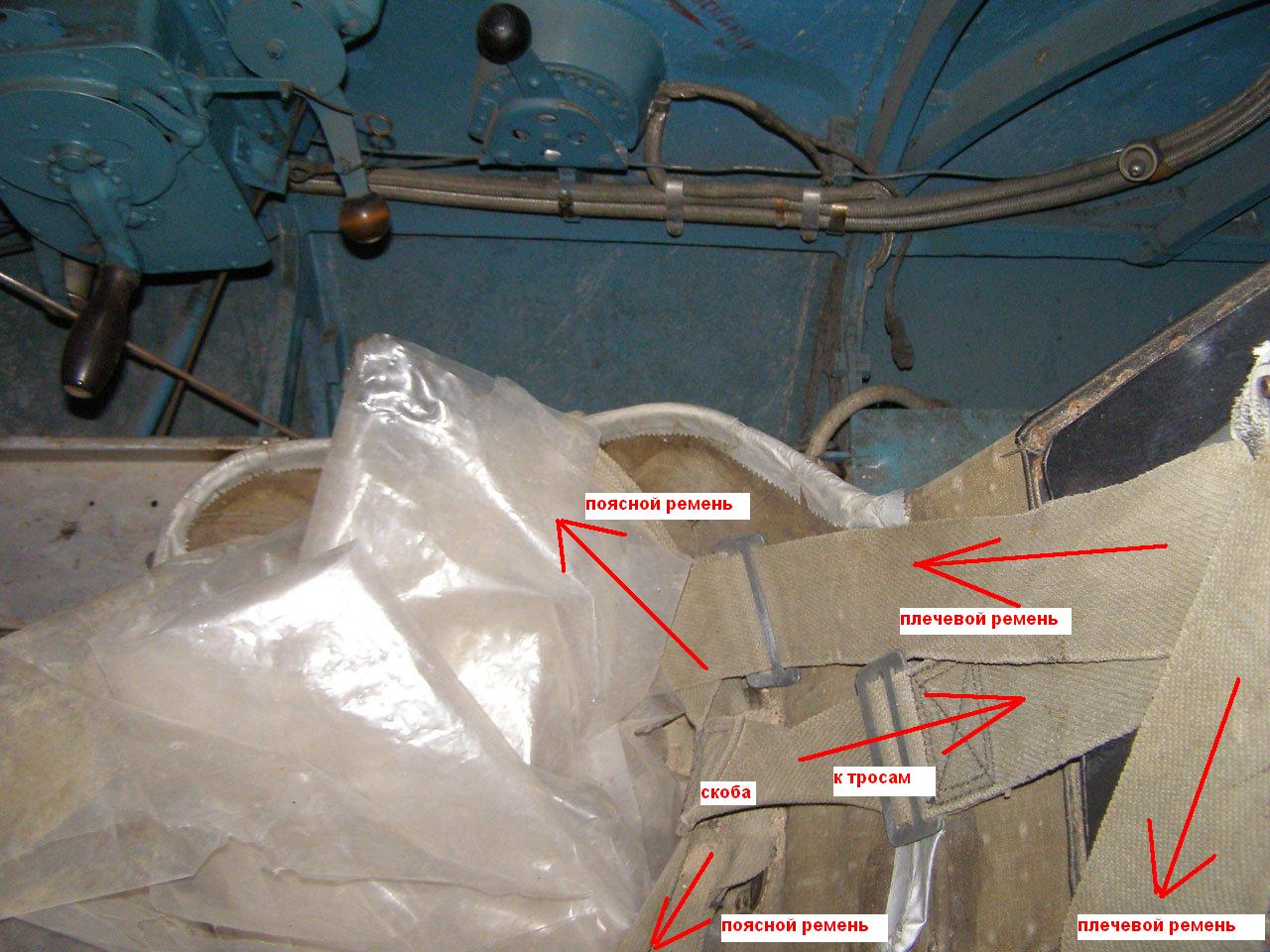 Если на словах то получается так - скоба внизу спинки, за нее крепится ремень, скоба вверху спинки (трос, закрепленный на каркасе кабины) ремень раздваивается на плечевые, потом пряжка-замок и переход в поясной. Поясной крепится к бокам корыта сиденья. Оба ремня соединяются некой круглой лабудой-замком. Ну и всякие пряжки регулировки длины. Конструкция по идее аналогична спортивным автомобилям получается.