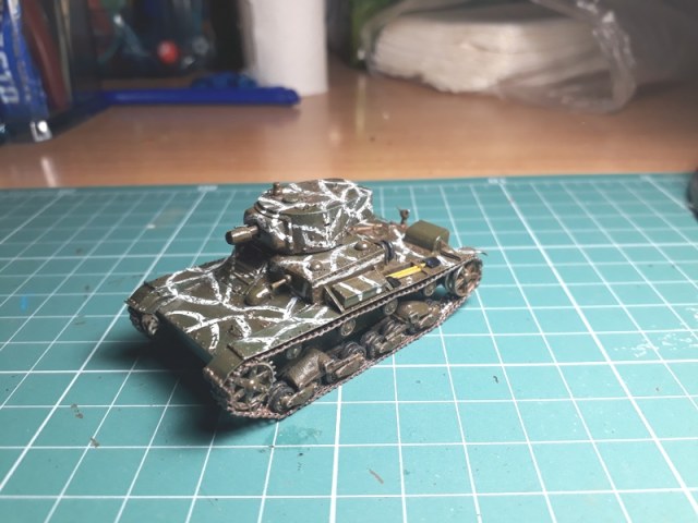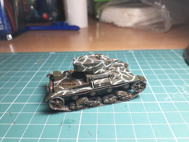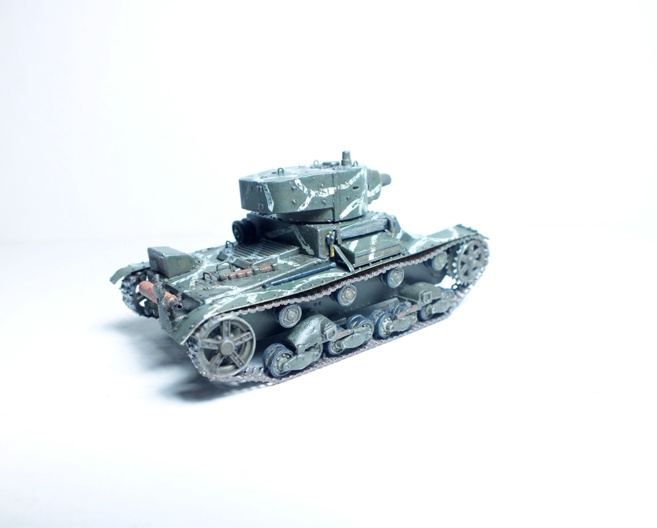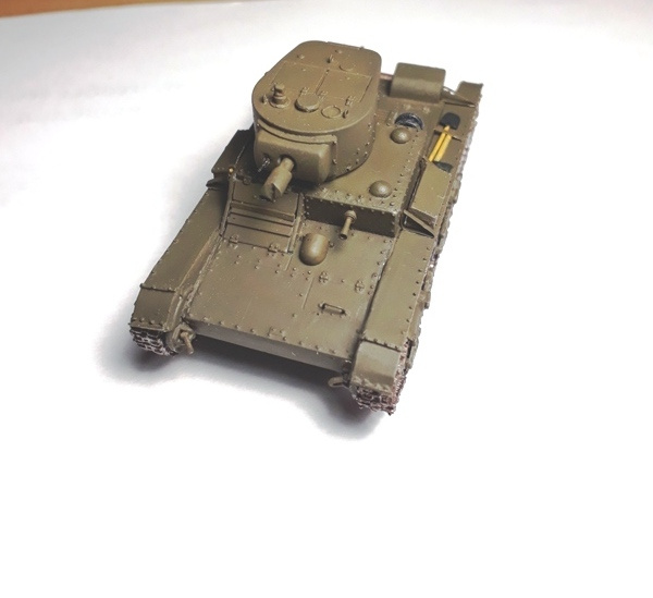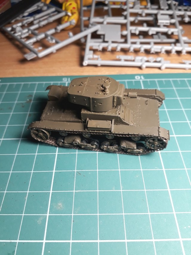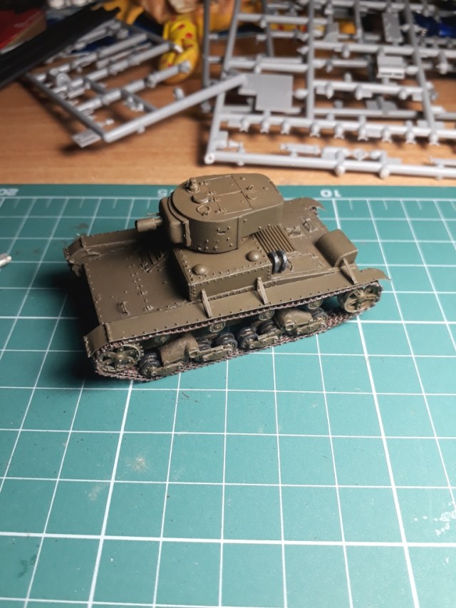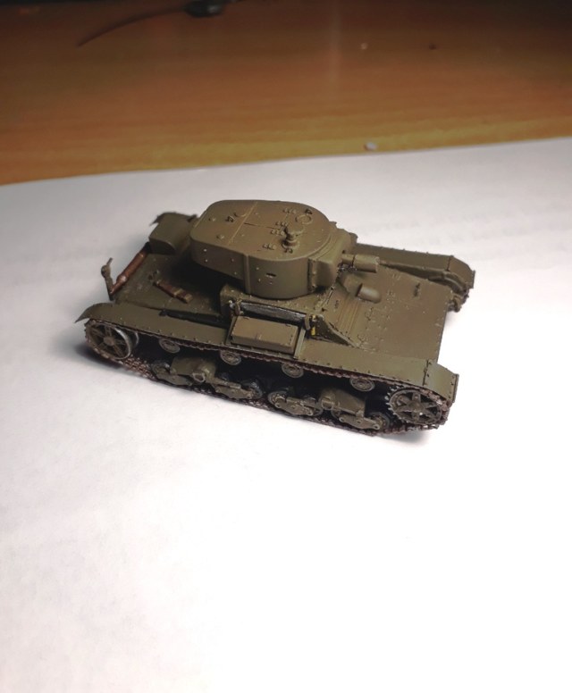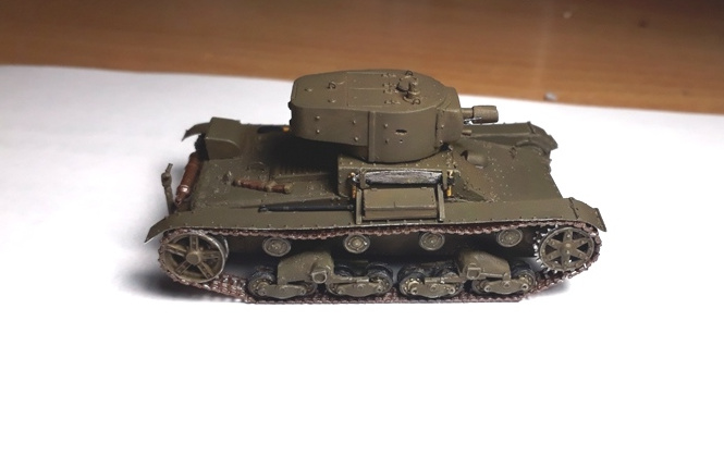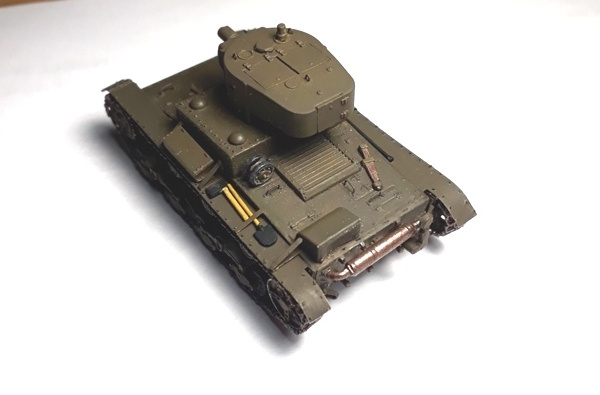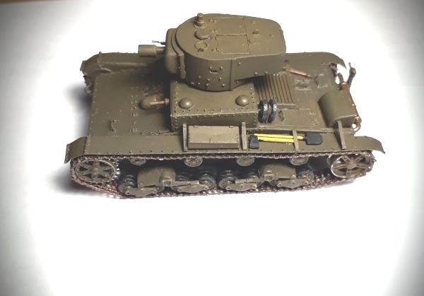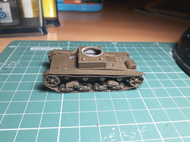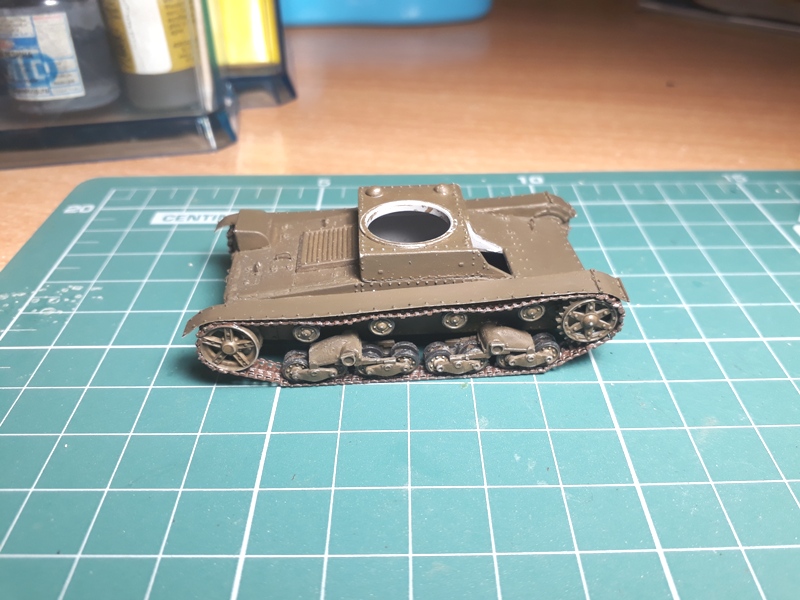 Однако ж взял себя в руки и матюкаясь закрыл отверстие подогнанным кусочком пластика. Получилось нормально. После этого кистью все в базу покрасил. Из того что осталось, это второй ящик ЗИП поставить, бронировку фар,и, возможно, изготовить прибор дымопуска на корме. Ну и конечно разложить инструменты. Вот что сейчас имею. В общем начинает походить на ОТ-130