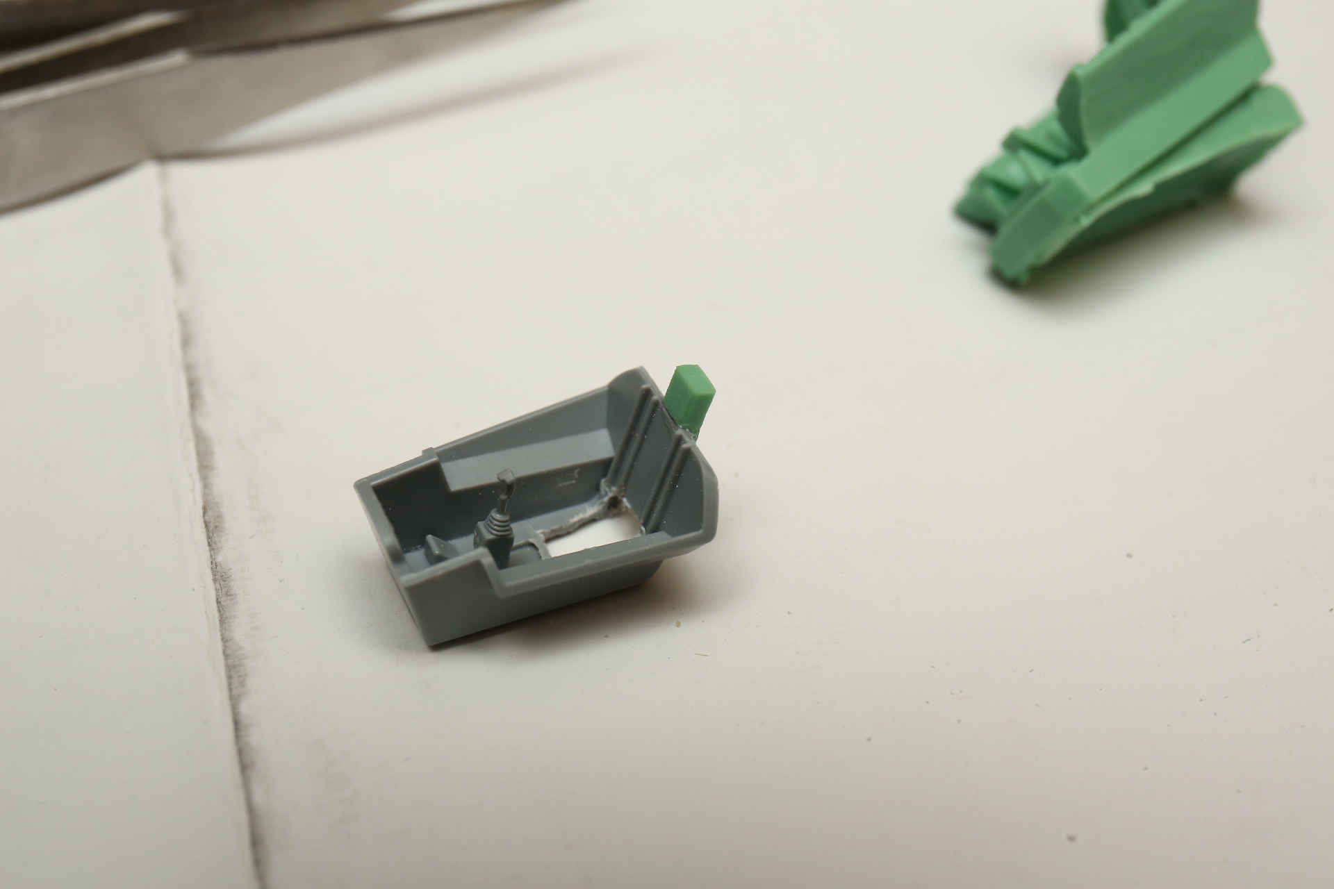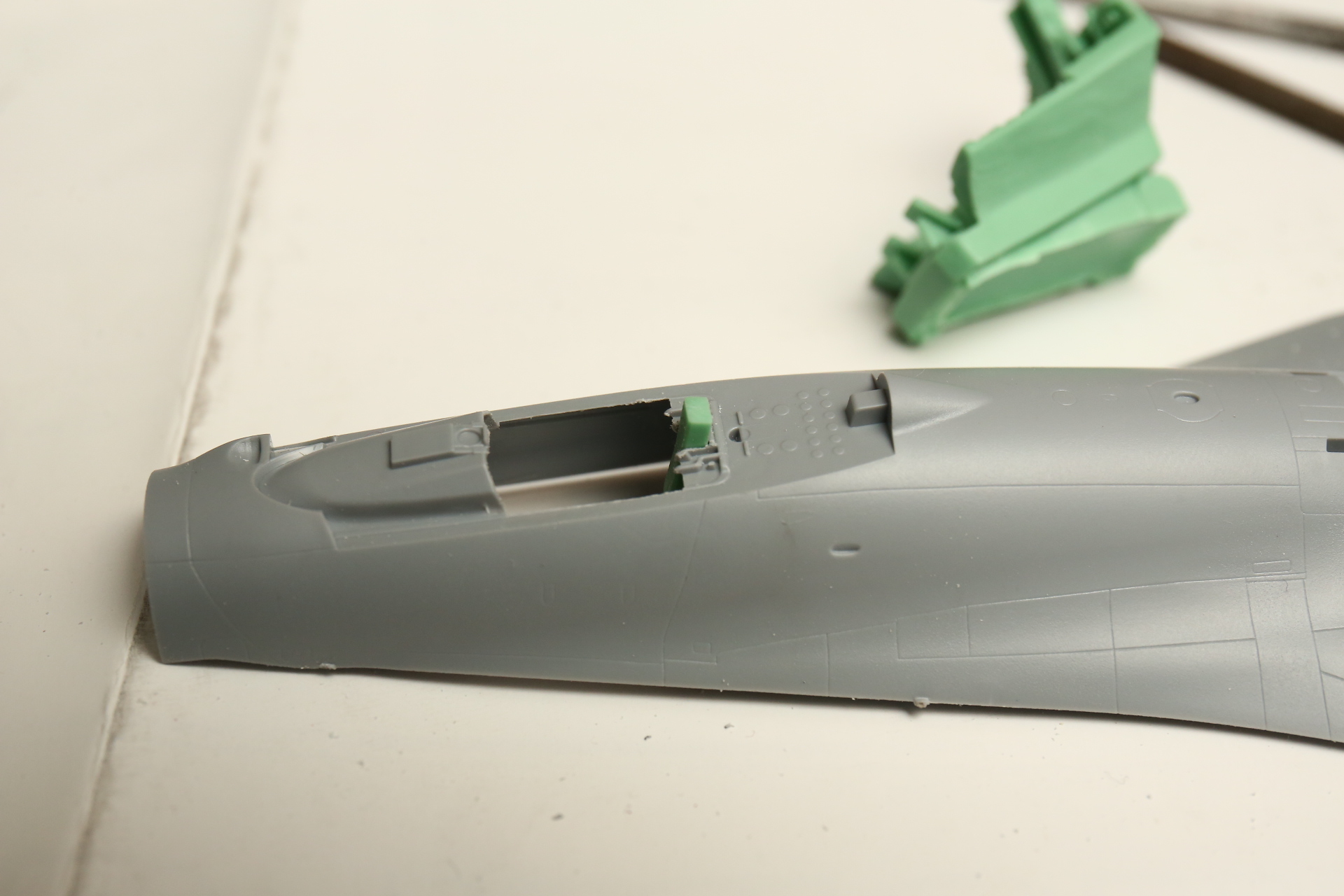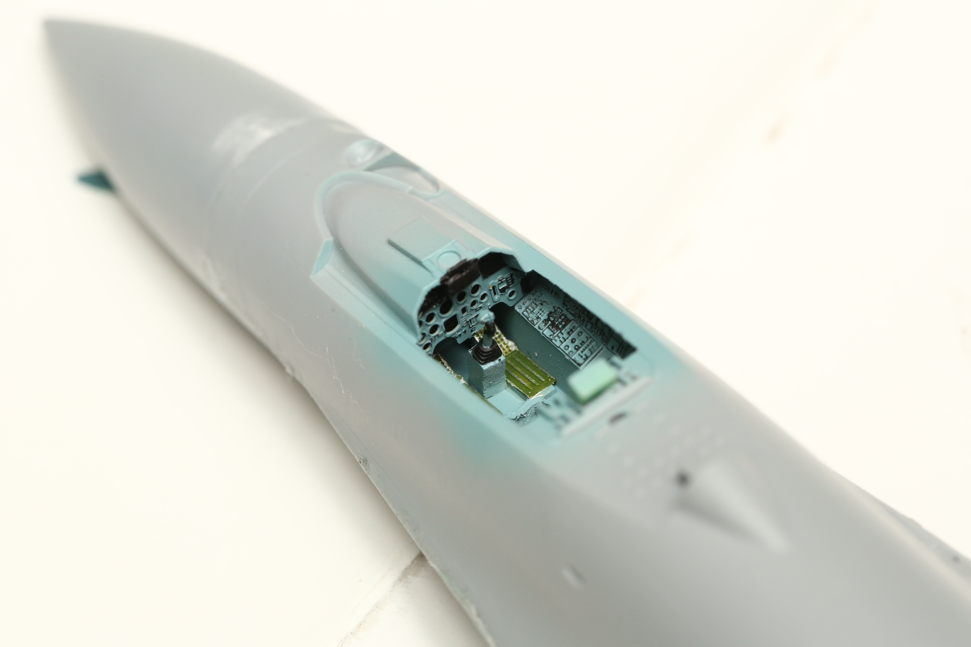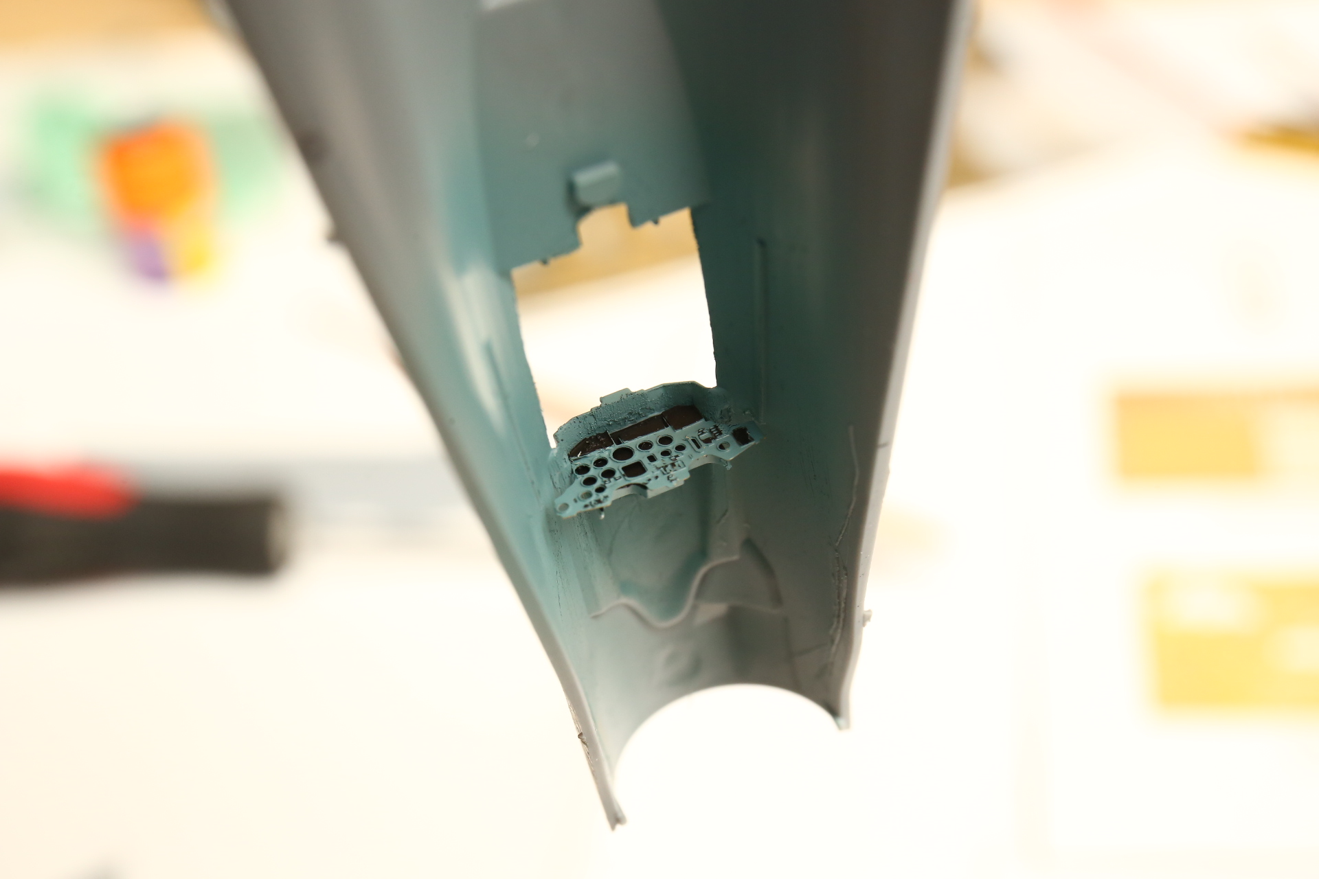 Оказалось, что кабина очень и очень тесная. При установке РУС ставится в упор к приборной доске, вперёд его не подать абсолютно. Смотрится убого. Кресло от неомеги тоже еле-еле влезает. Подивившись такой промаху Звезды я попробовал поставить её кресло и посадить пилота. Надо отметить, что и кресло и пилот "сели" в кабину хорошо, но пространства в ней не прибавилось и смотрится всё это, на мой взгляд, плохо. Попримеряв всё это много раз принял решение отодвинуть приборку вперёд примерно на миллиметр - полтора. Пришлось для этого её обпиливать. А дальше работа с приборкой-травлением.