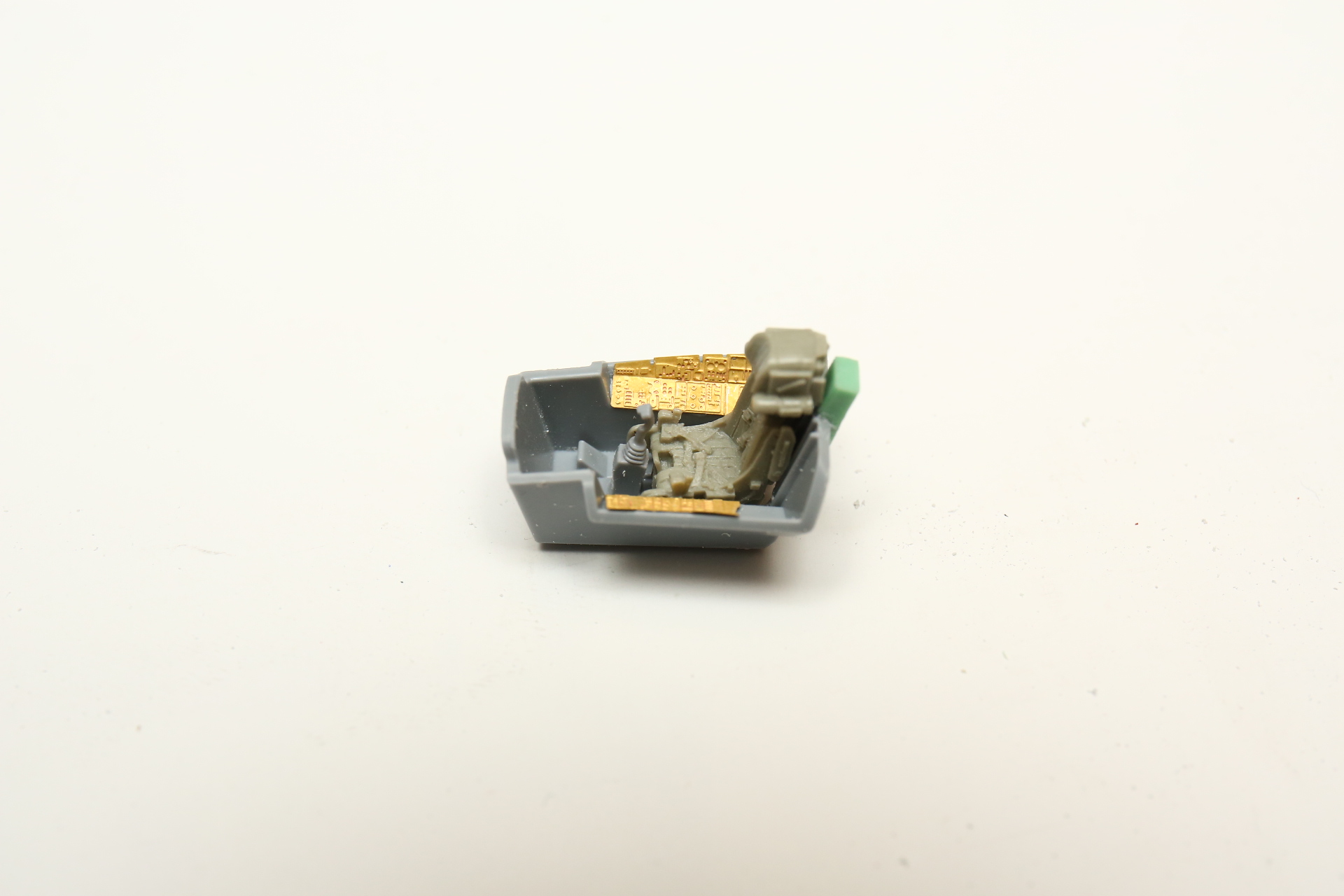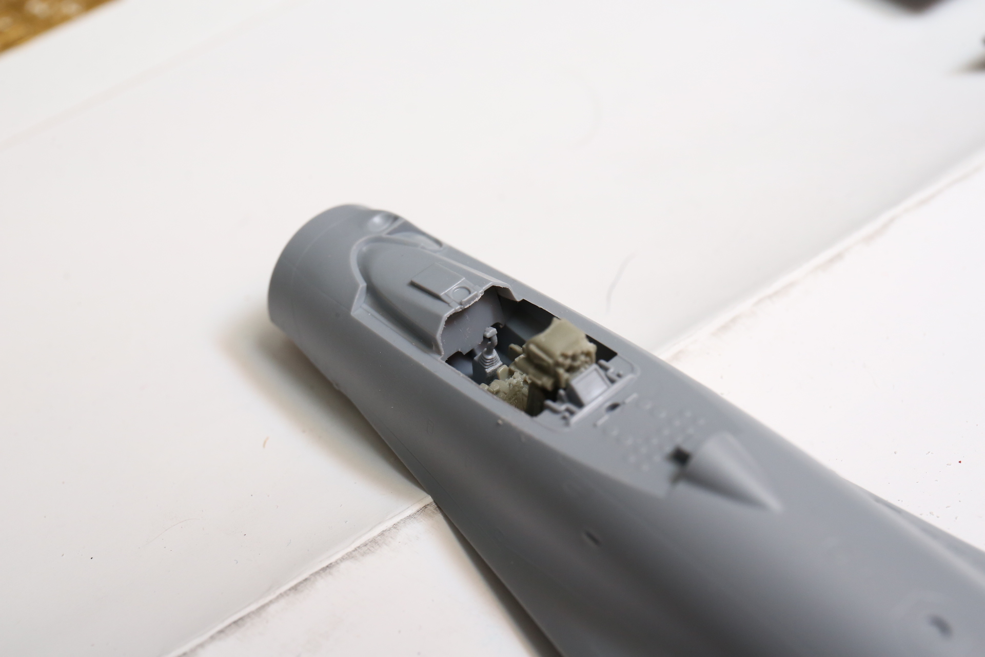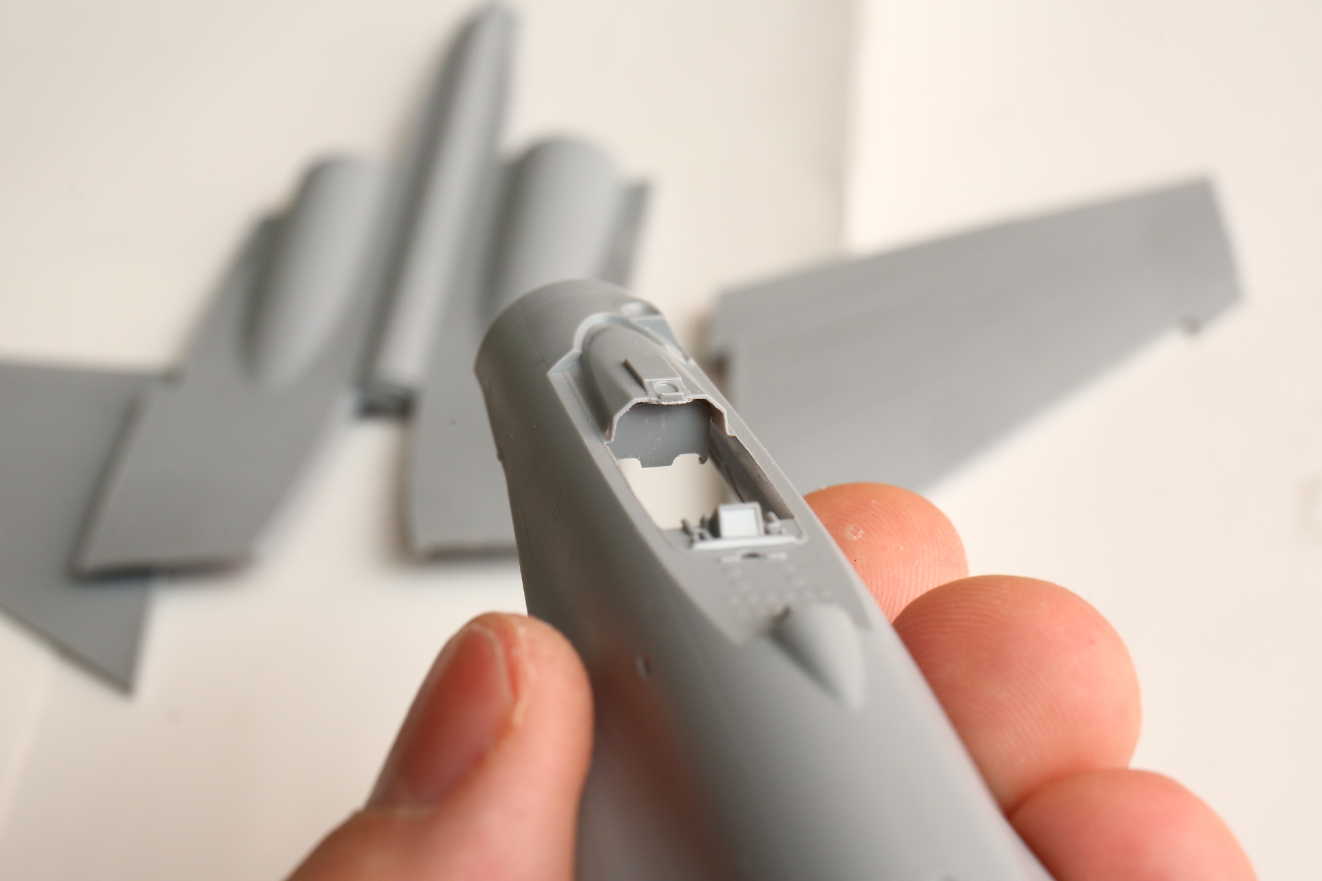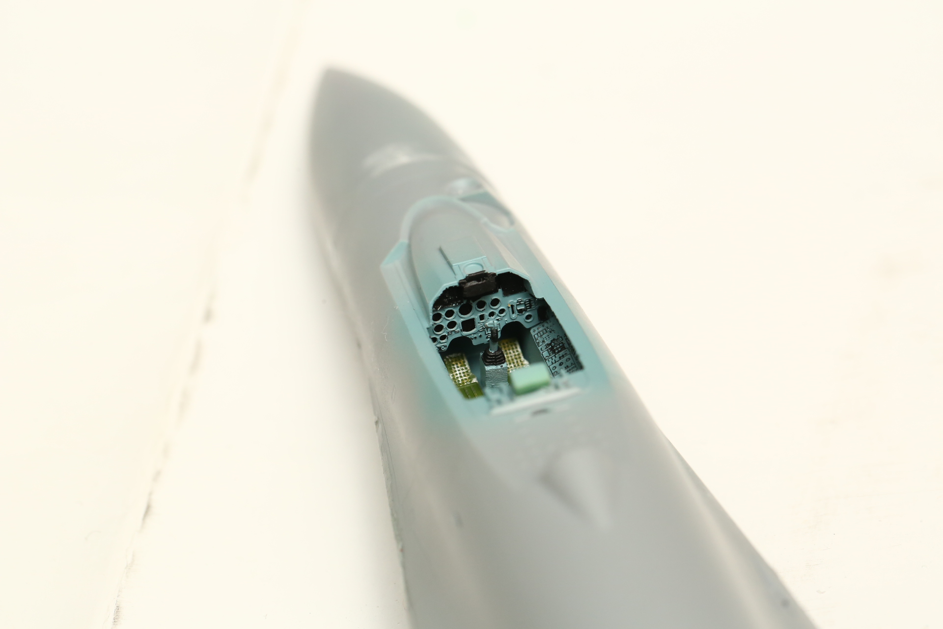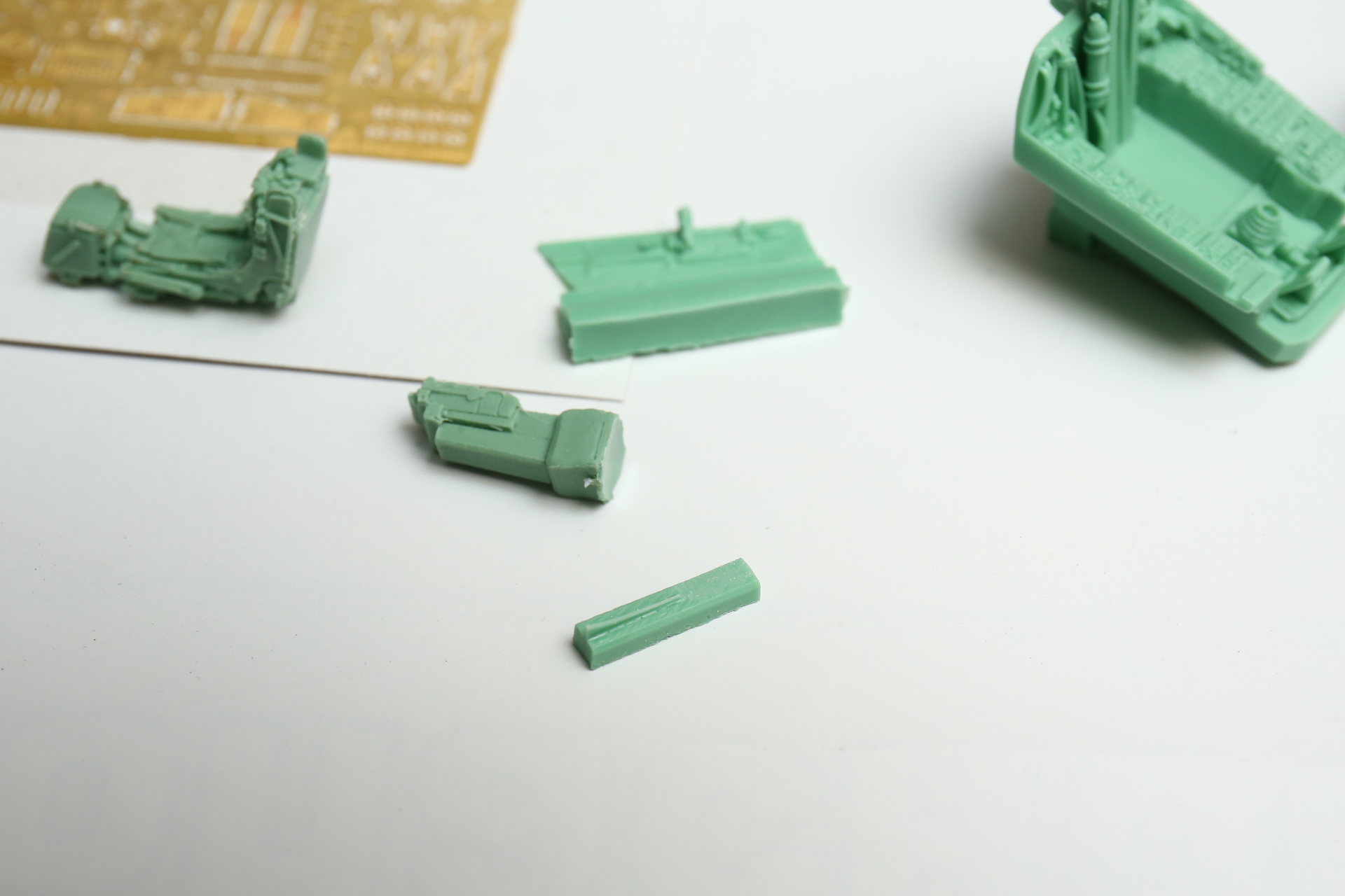 Оказалось, что кабина очень и очень тесная. При установке РУС ставится в упор к приборной доске, вперёд его не подать абсолютно. Смотрится убого. Кресло от неомеги тоже еле-еле влезает. Подивившись такой промаху Звезды я попробовал поставить её кресло и посадить пилота. Надо отметить, что и кресло и пилот "сели" в кабину хорошо, но пространства в ней не прибавилось и смотрится всё это, на мой взгляд, плохо. Попримеряв всё это много раз принял решение отодвинуть приборку вперёд примерно на миллиметр - полтора. Пришлось для этого её обпиливать. А дальше работа с приборкой-травлением.
