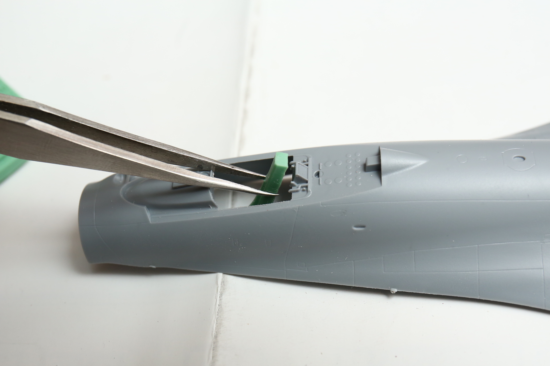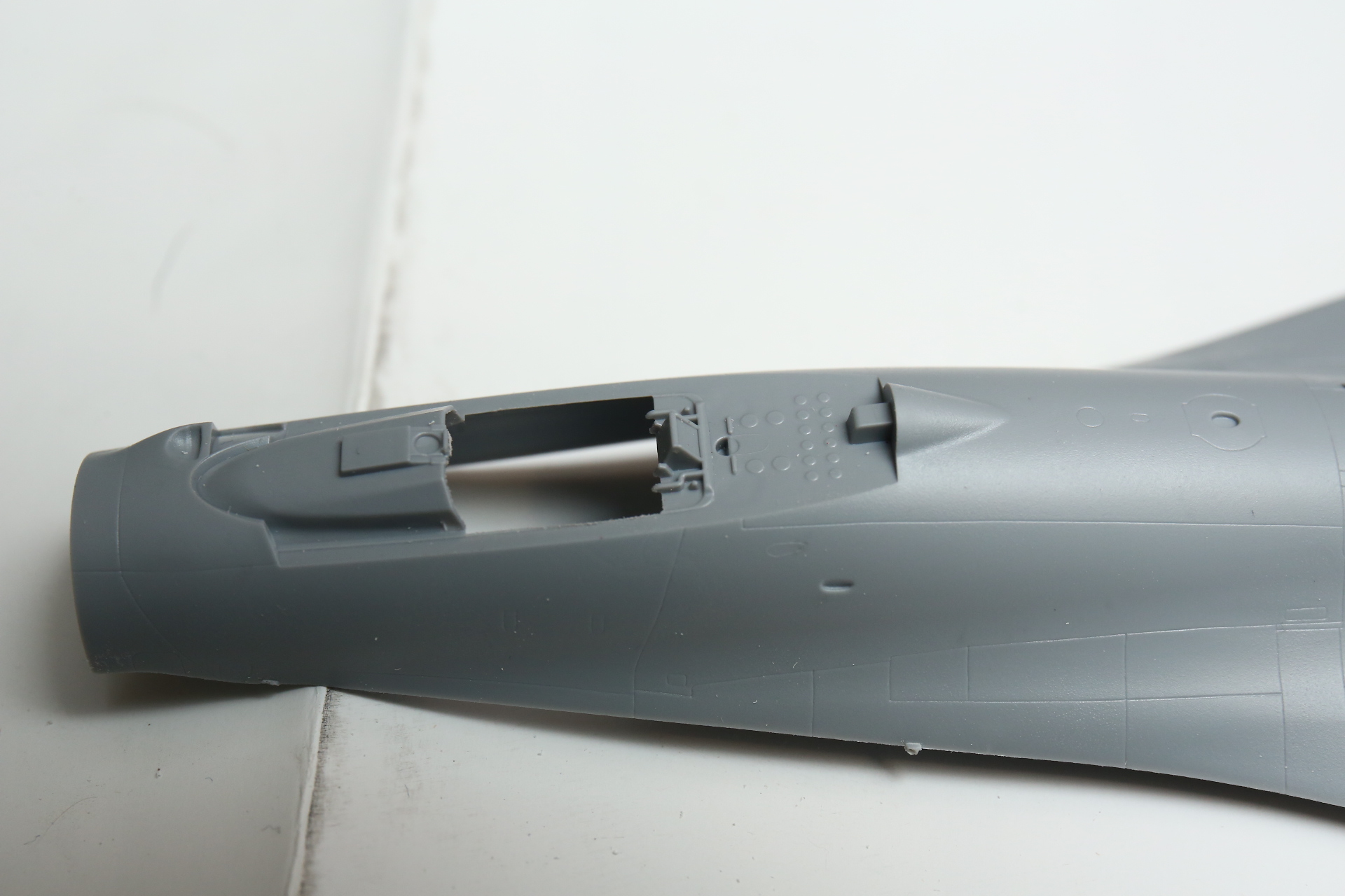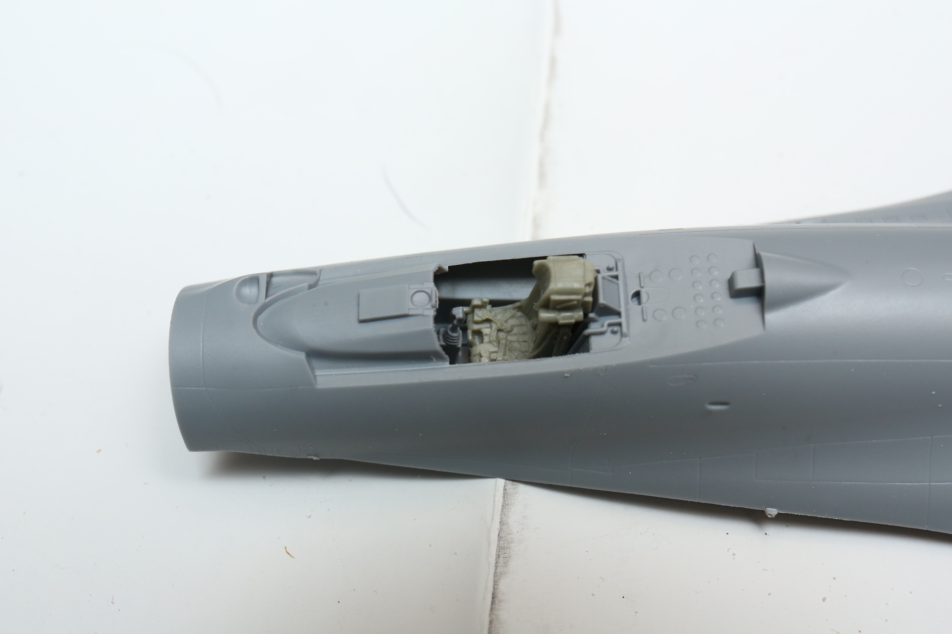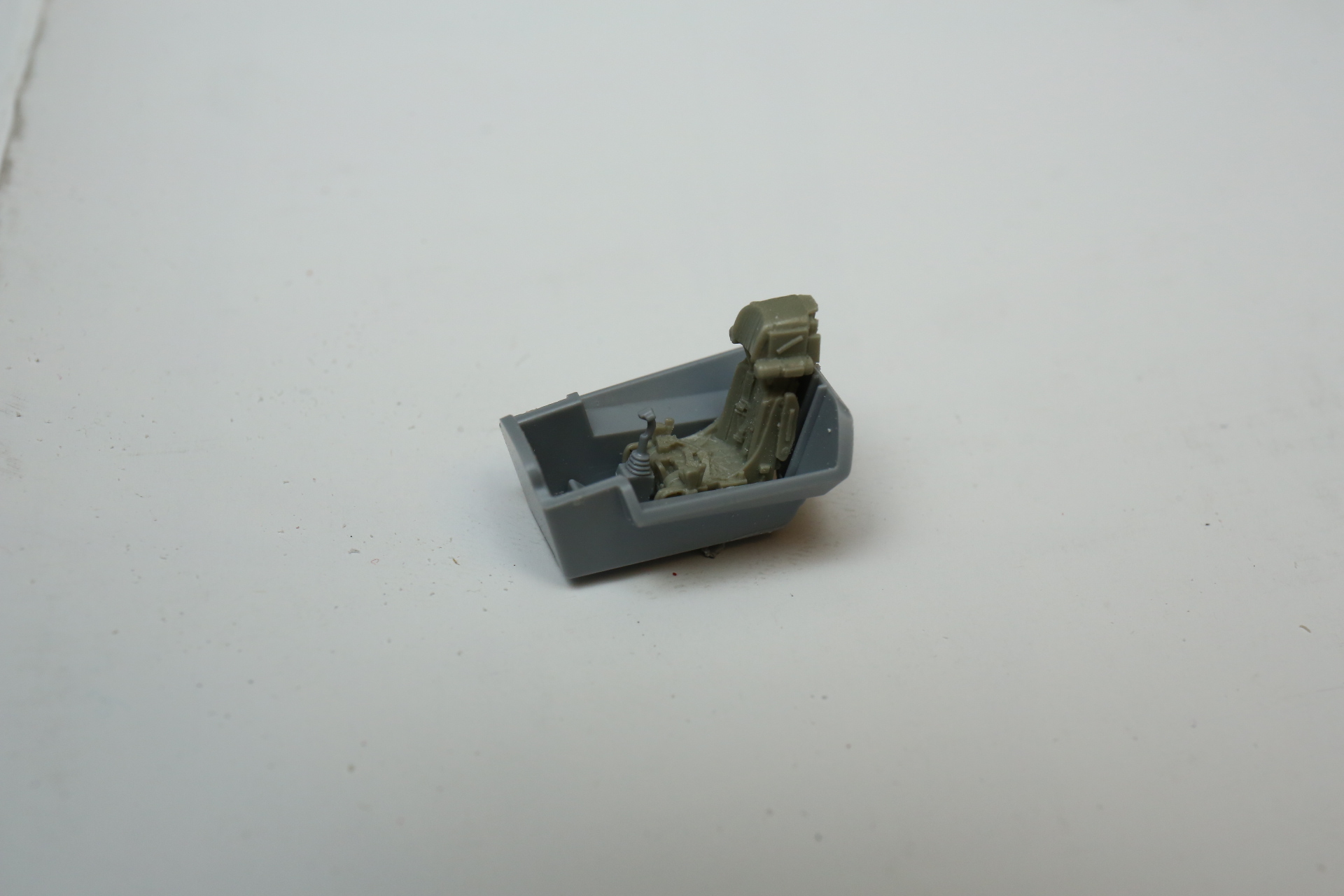 Оказалось, что кабина очень и очень тесная. При установке РУС ставится в упор к приборной доске, вперёд его не подать абсолютно. Смотрится убого. Кресло от неомеги тоже еле-еле влезает. Подивившись такой промаху Звезды я попробовал поставить её кресло и посадить пилота. Надо отметить, что и кресло и пилот "сели" в кабину хорошо, но пространства в ней не прибавилось и смотрится всё это, на мой взгляд, плохо. Попримеряв всё это много раз принял решение отодвинуть приборку вперёд примерно на миллиметр - полтора. Пришлось для этого её обпиливать. А дальше работа с приборкой-травлением.