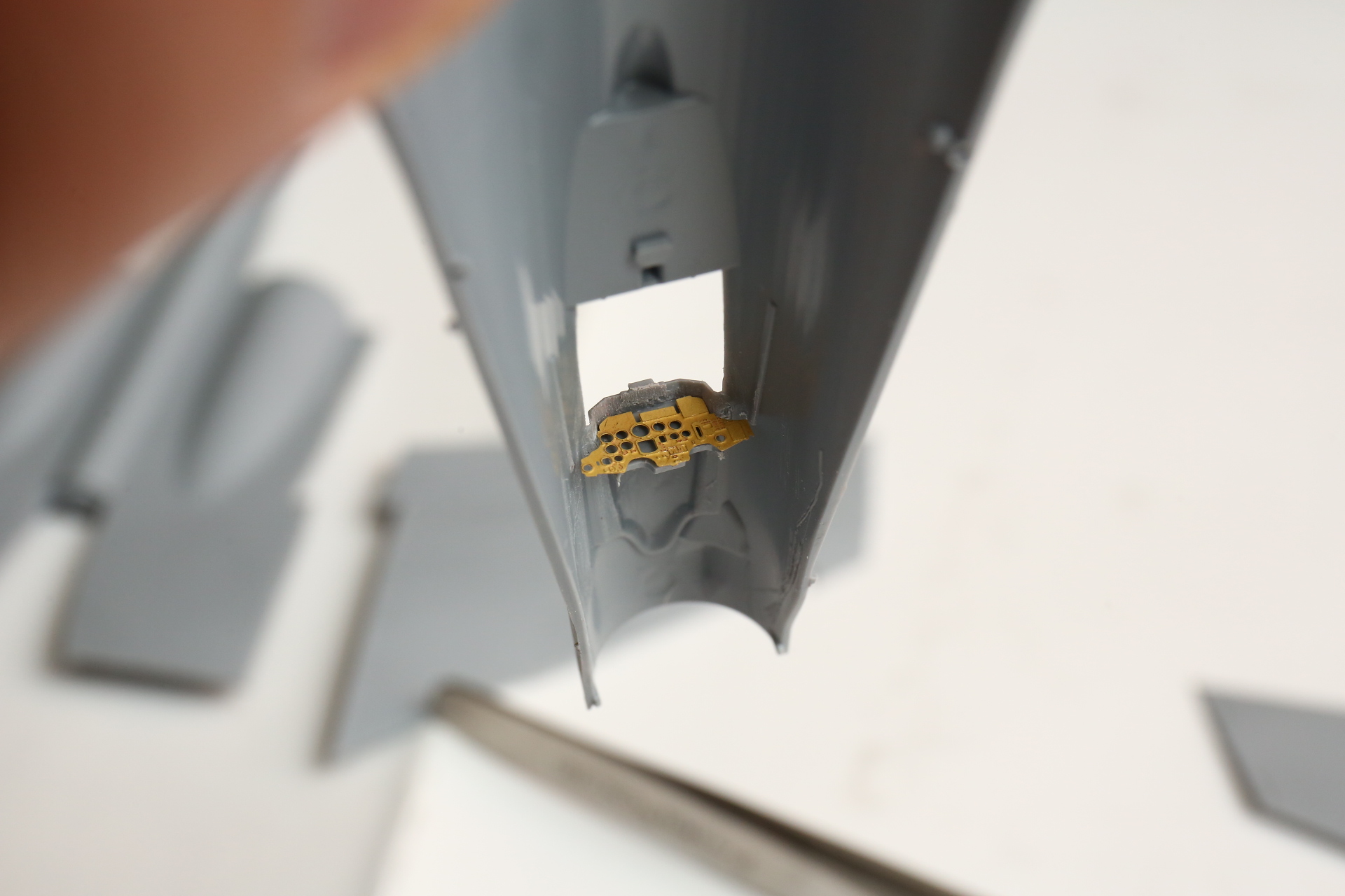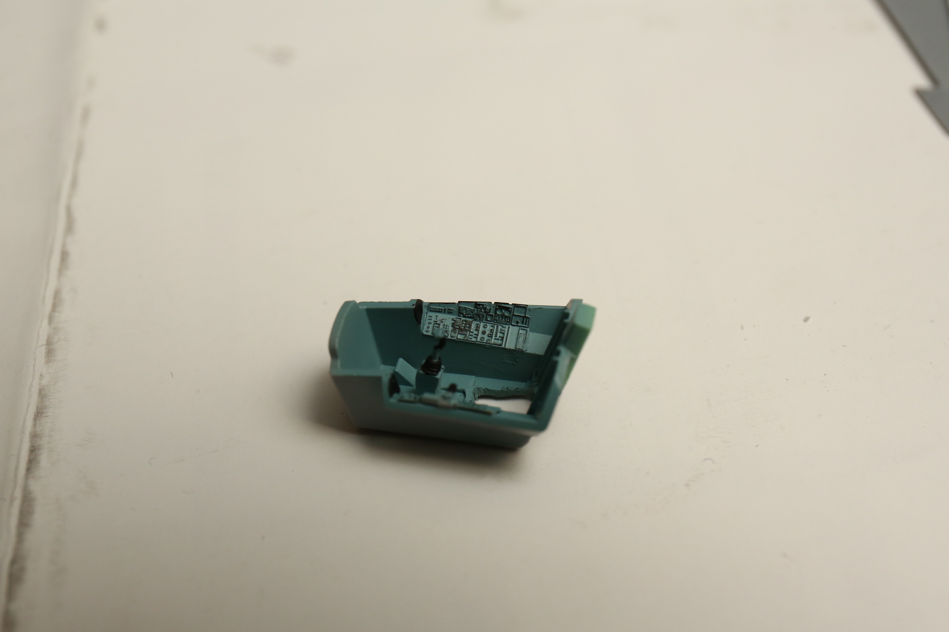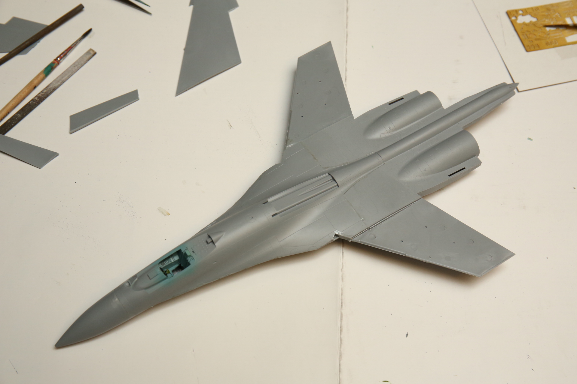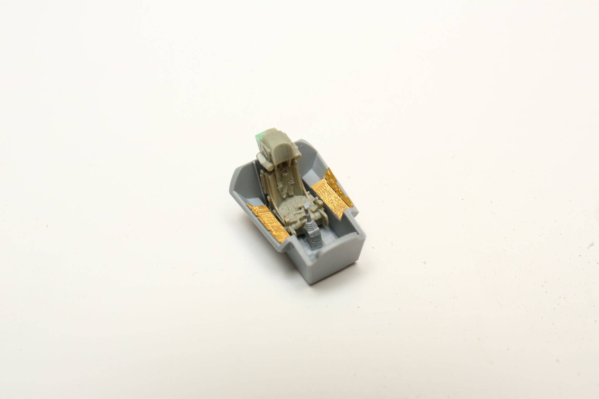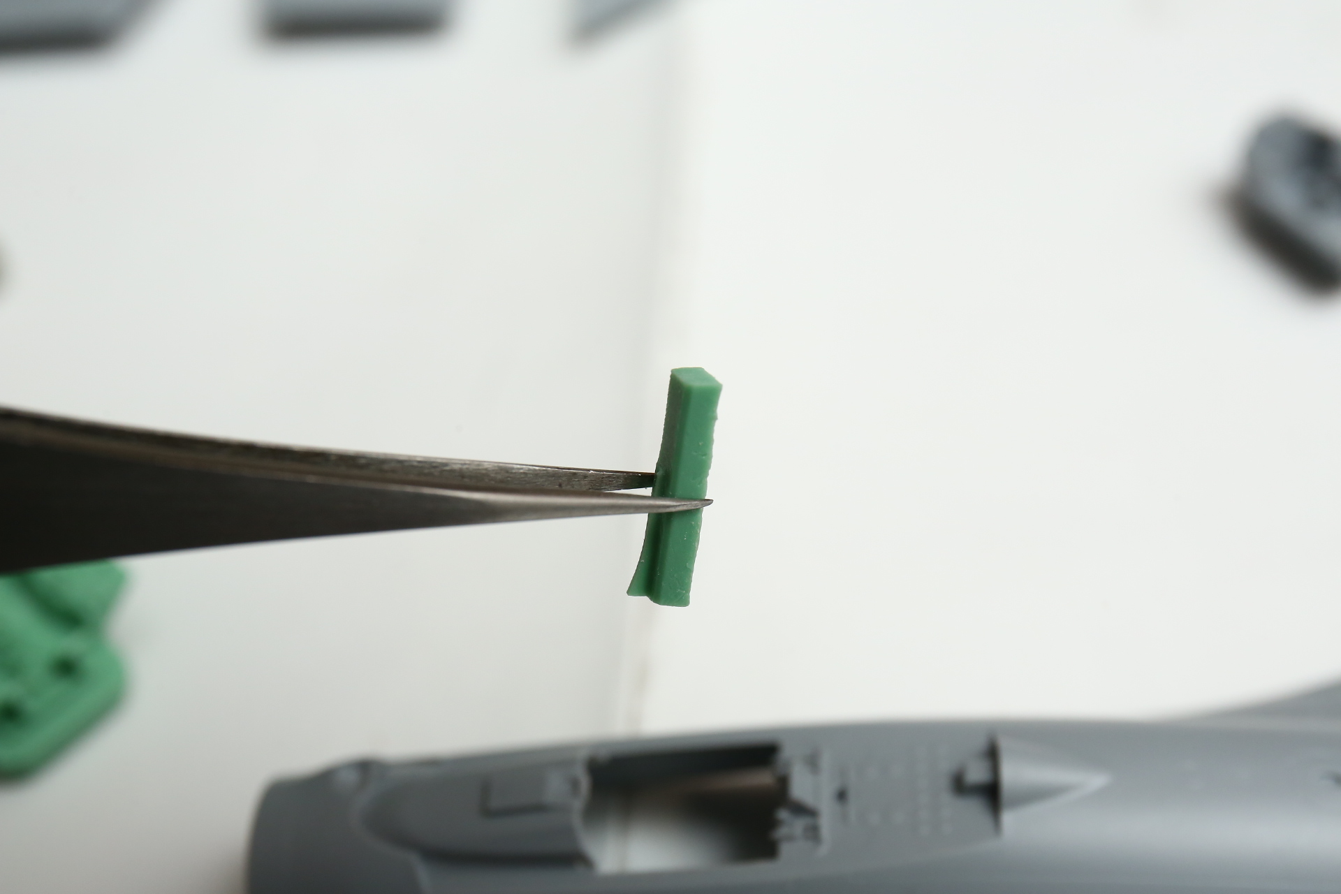 Оказалось, что кабина очень и очень тесная. При установке РУС ставится в упор к приборной доске, вперёд его не подать абсолютно. Смотрится убого. Кресло от неомеги тоже еле-еле влезает. Подивившись такой промаху Звезды я попробовал поставить её кресло и посадить пилота. Надо отметить, что и кресло и пилот "сели" в кабину хорошо, но пространства в ней не прибавилось и смотрится всё это, на мой взгляд, плохо. Попримеряв всё это много раз принял решение отодвинуть приборку вперёд примерно на миллиметр - полтора. Пришлось для этого её обпиливать. А дальше работа с приборкой-травлением.