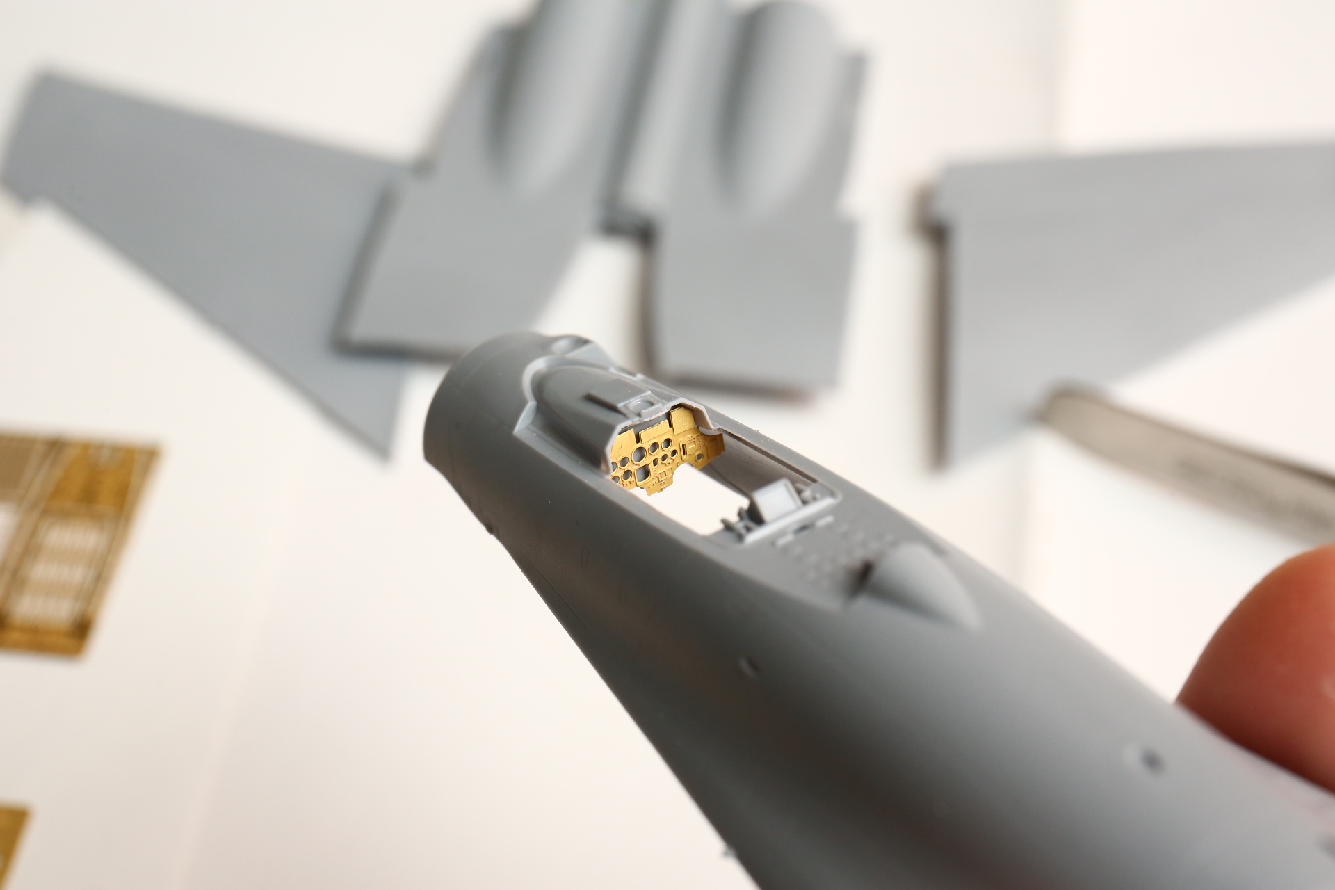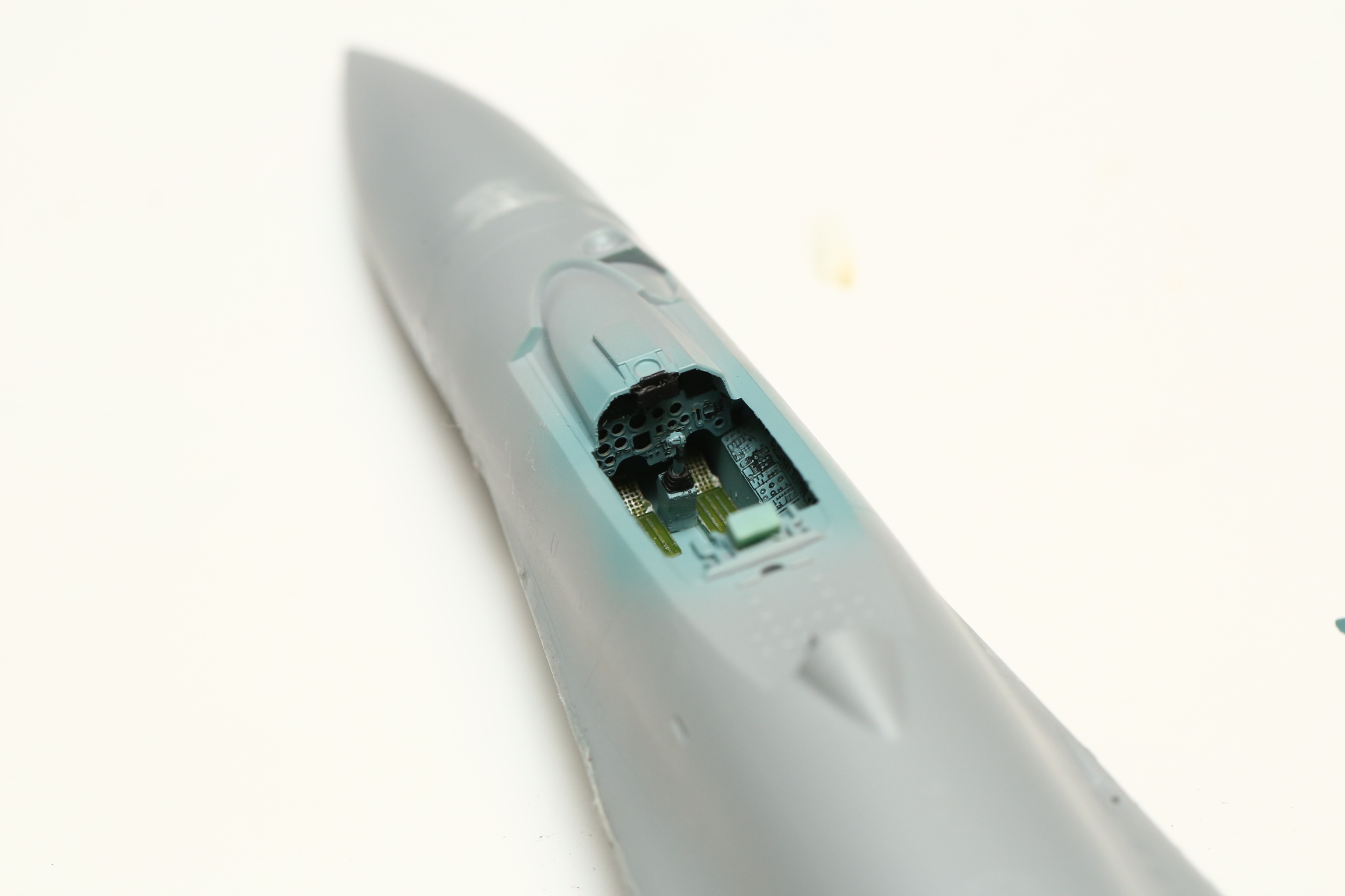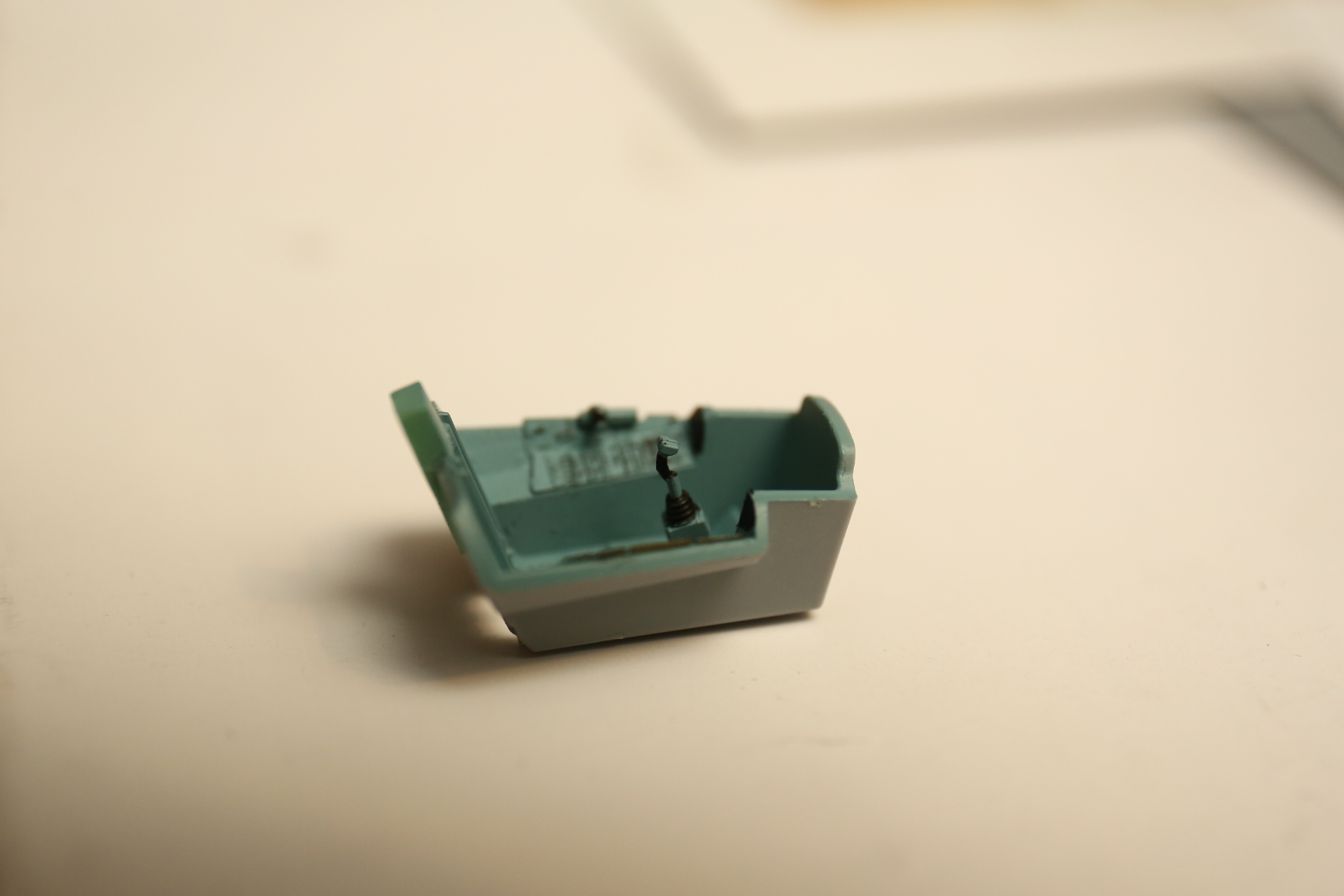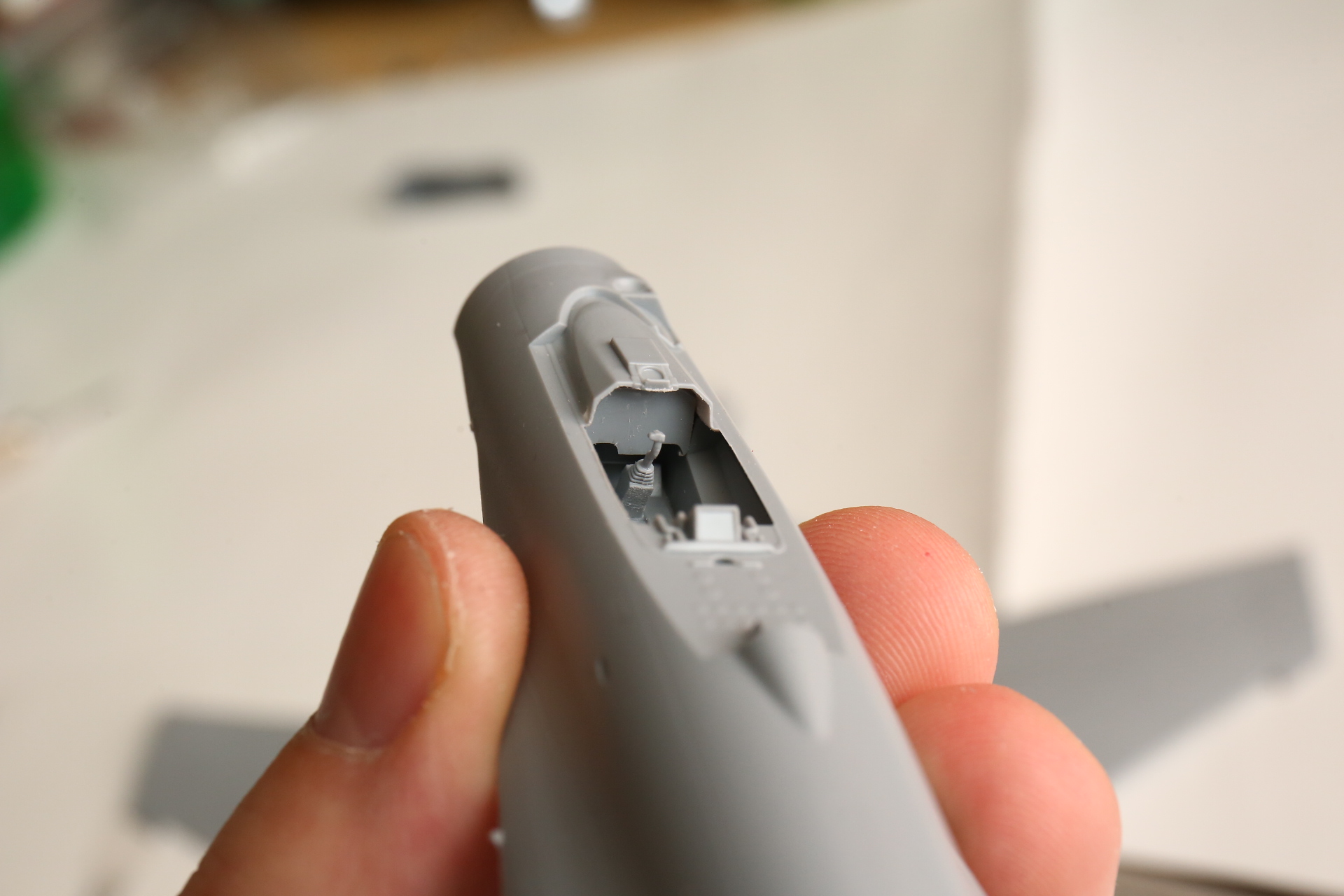 Оказалось, что кабина очень и очень тесная. При установке РУС ставится в упор к приборной доске, вперёд его не подать абсолютно. Смотрится убого. Кресло от неомеги тоже еле-еле влезает. Подивившись такой промаху Звезды я попробовал поставить её кресло и посадить пилота. Надо отметить, что и кресло и пилот "сели" в кабину хорошо, но пространства в ней не прибавилось и смотрится всё это, на мой взгляд, плохо. Попримеряв всё это много раз принял решение отодвинуть приборку вперёд примерно на миллиметр - полтора. Пришлось для этого её обпиливать. А дальше работа с приборкой-травлением.