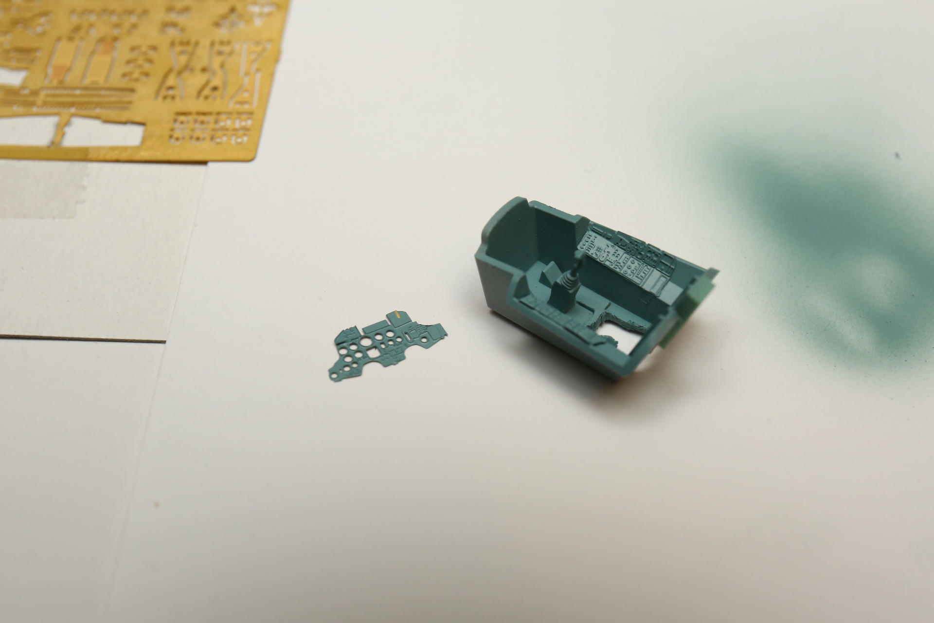Это я от кабины устал! Но вернёмся всё-таки к ней!! Есть для неё у меня Акан, цвет интерьера Сушек. Но мне он показался слишком уж тёмным. Я разбавил этот цвет белым, о чём не жалею и задул всё из аэрографа. А приборку Звезды, смещённую чуть вперёд покрасил чёрным, чтобы на неё потом встала травлёная приборка и все стрелочные приборы "заиграют" чёрными кругляшками!