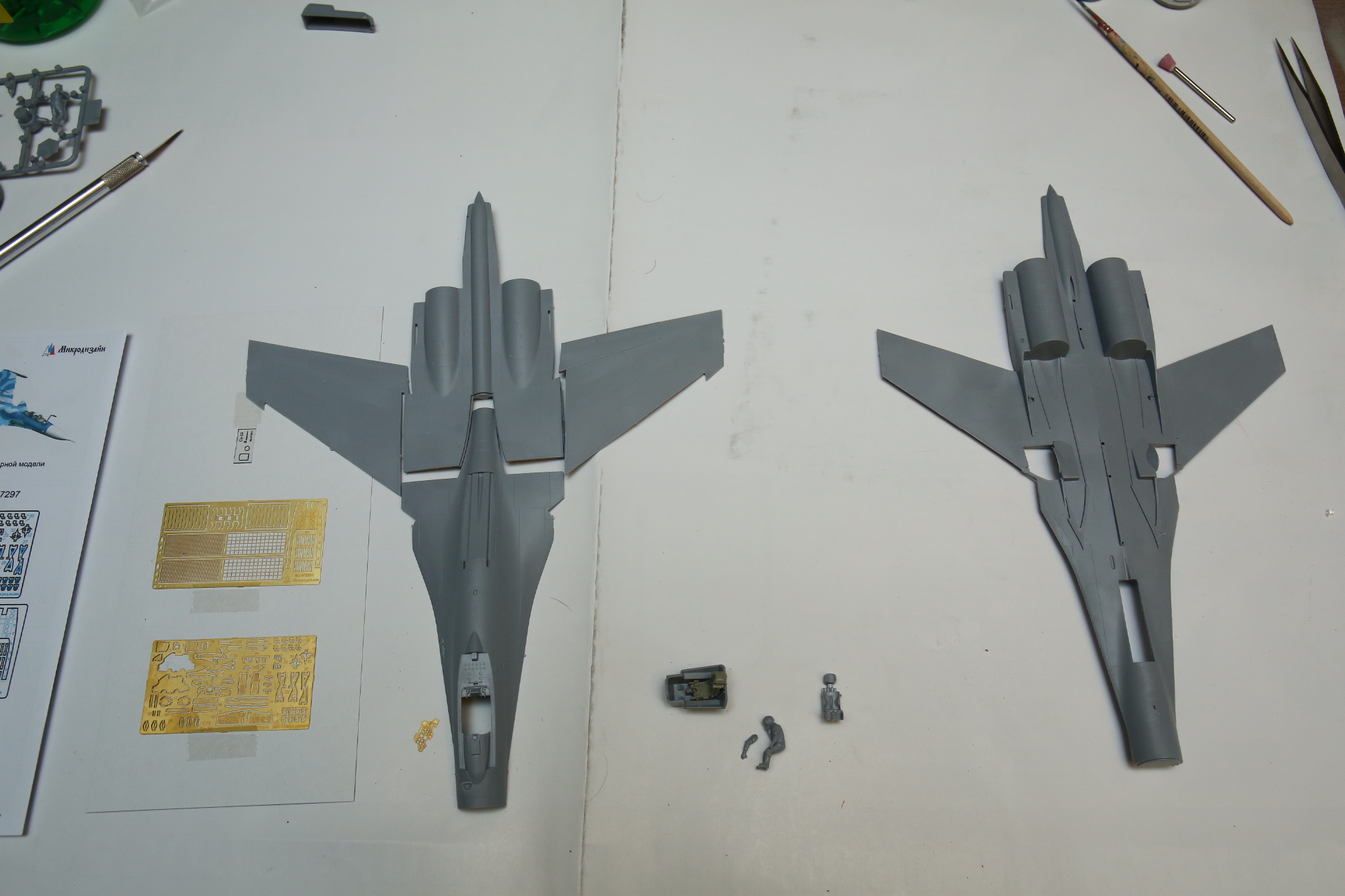 Здравствуйте, уважаемые каропчане! Запускаю свою первую сказку о постройке! Хочу в душевной кампании построить модель самого любимого самолёта! Давно мечтал сделать сказку, но по ряду причин катастрофически не хватает времени, перерыв в хобби длится уже не один год. Сейчас, пока жена с двумя дочерьми в отъезде, очень хочу успеть собрать эту машинку. Сроки маленькие - три недели. Доработок почти не будет, за исключением добавления кое-какого афтермаркета. Есть несколько наборов травления, бегемотовская декаль, кресло от неомеги и колесо с грязезащитным щитком от древних дров фирмы Airfix. Впервые буду пробовать окрасить "Сушку" с помощью масок из тамиевской ленты или пластилиновых колбасок. Любые советы и обсуждение различных способов сборки и окраски приветствуется! Заходите на огонёк, буду всем рад!