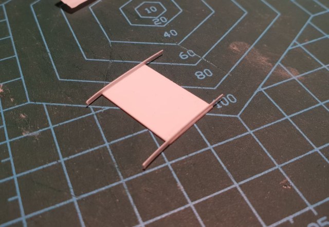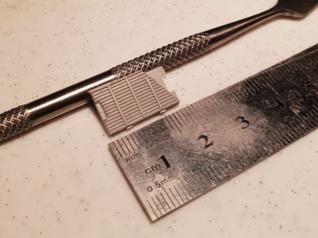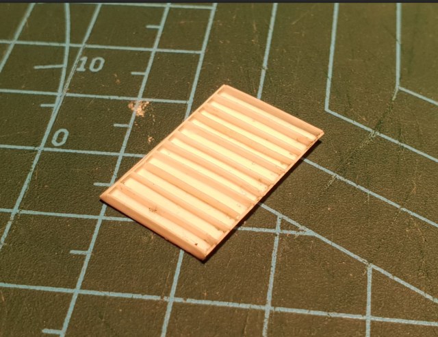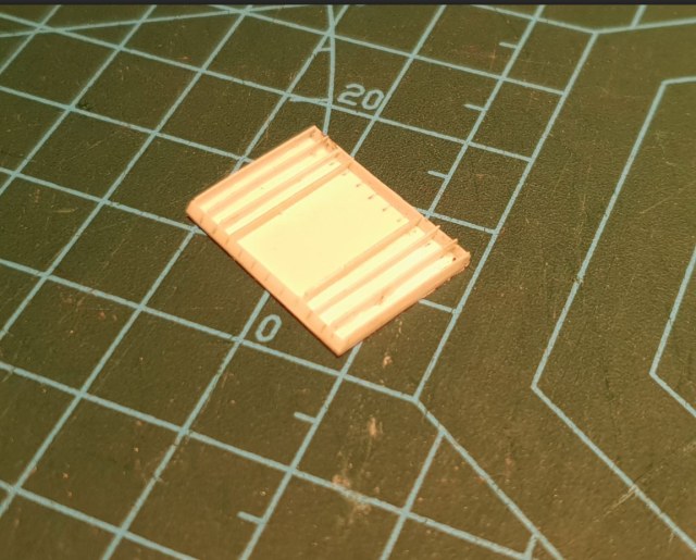 Размеры в масштабе - длина 23мм, ширина 15мм, толщина 1мм и ширина перемычек - если чтоб прямо масштабно, то где-то 0,2мм, как раз под толщину доширак-пласта. Ячейки решетки должны быть где-то 2мм на 1мм.