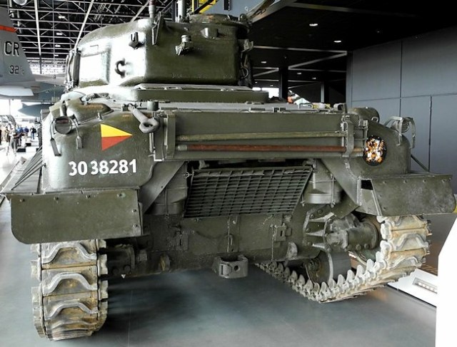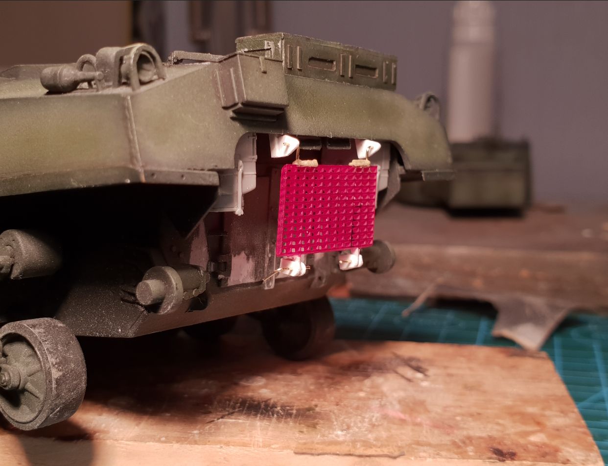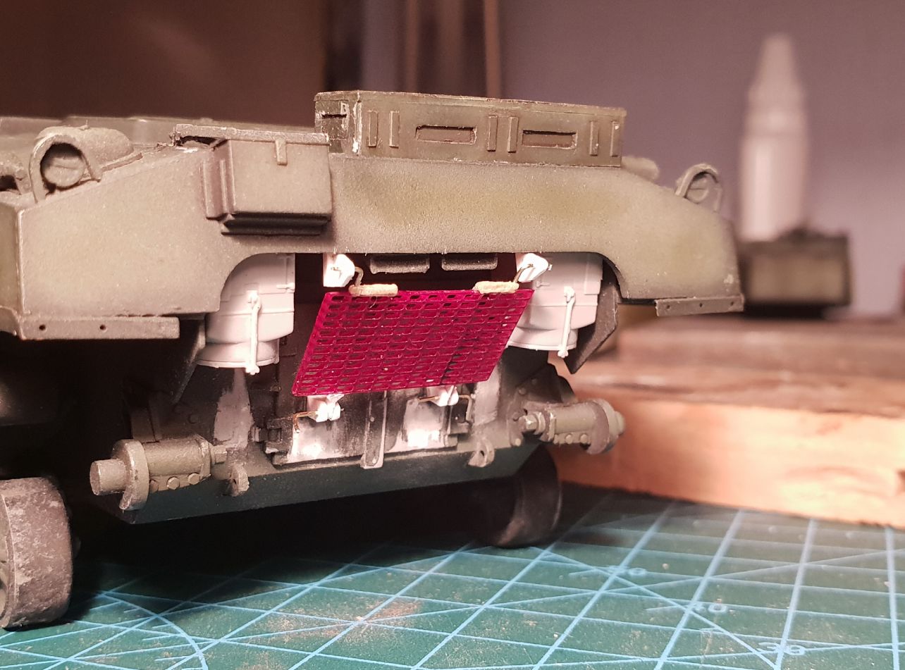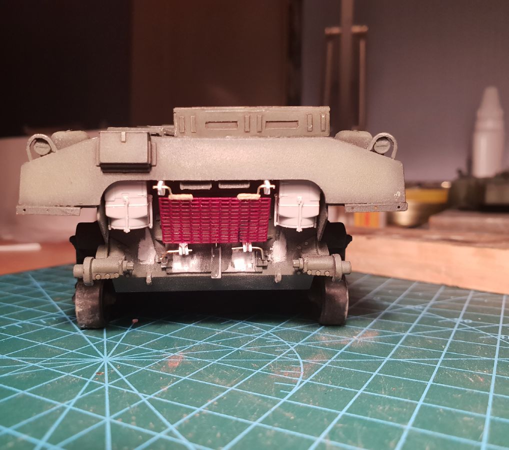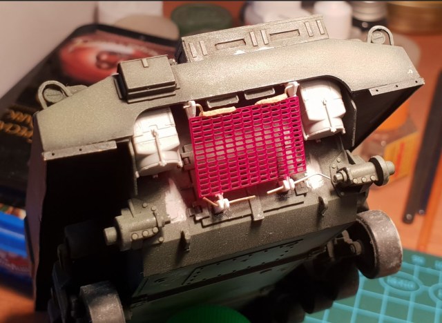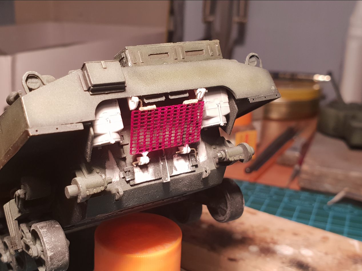 Занимаюсь допиливанием Шермана до состояния прототипа на фотографии. На прототипе сзади есть решетка, которая является частью системы воздушного охлаждения. Производитель, разумеется, про такую решетку даже думать не думал.