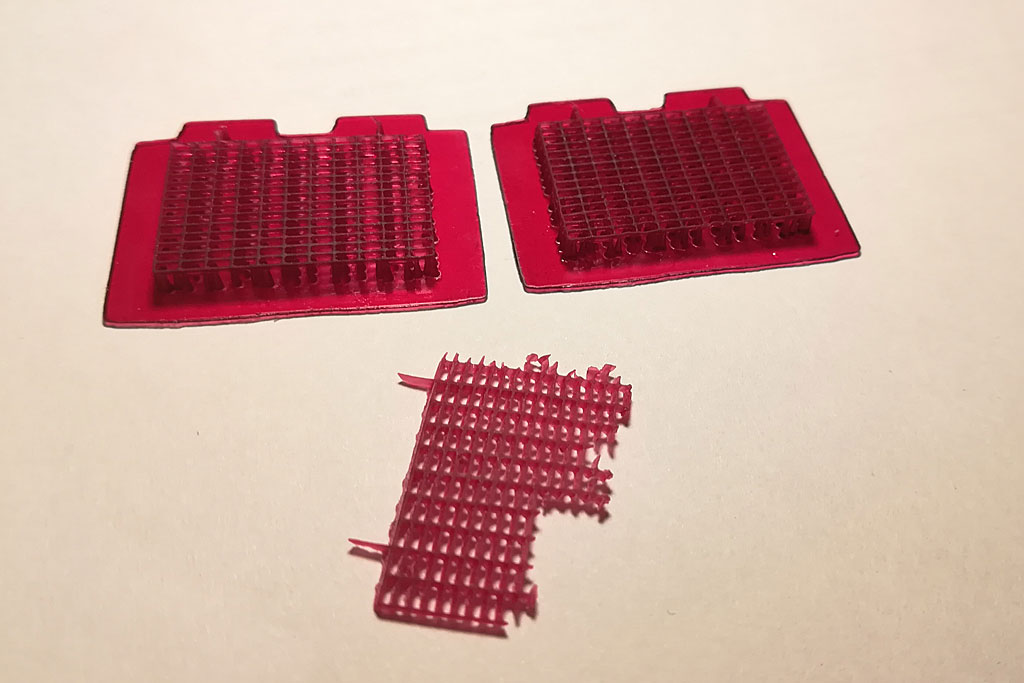 Вот результаты первой печати, по честному все три решетки брак. Но две, которые на поддержках вполне можно отправить в работу, исправив бра к с помощью полистирола.