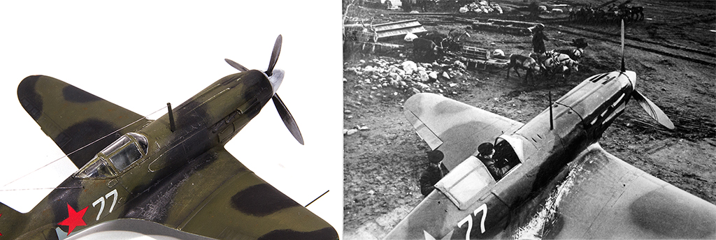 у МиГ-3 в ремонте - двойного изгиба цифр в принципе нельзя увидеть, так как нижняя часть скрыта, но все равно видно, что шрифт иначе и сам номер находится ближе к фонарю. и кок не весь светлый, а частично, в отличии от Заполярного