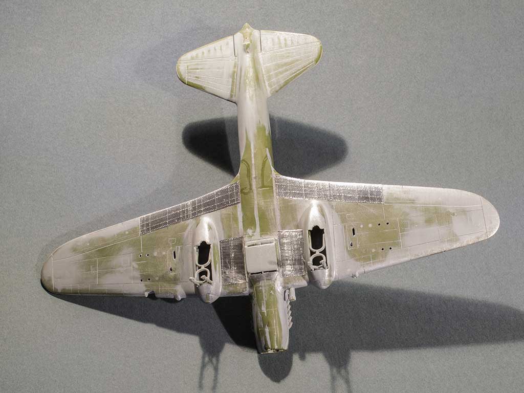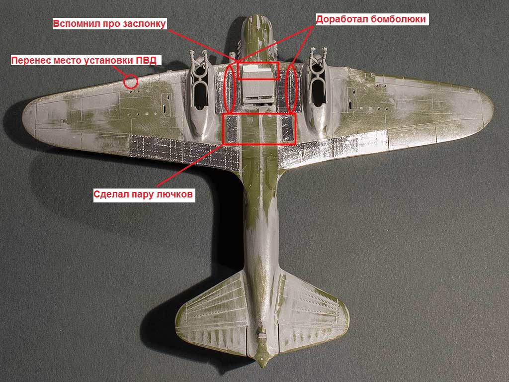 Бомболюки должны иметь щель стыка. Расшивку я не вижу на фото, но: Снизу в центроплане симметрично находится по 2 люка бомбоотсеков и по 1 люку для осмотра баллонов сжатого воздуха. На верхней поверхности находится по 4 люка для укладки и осмотра подвески бомб, по 2 люка для осмотра цилиндров подъема и выпуска шасси и подключения воздушных тормозов. На правой консоли дополнительный люк для подсоединения трубки Пито.