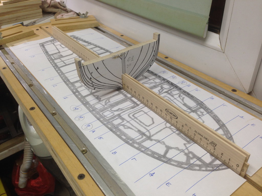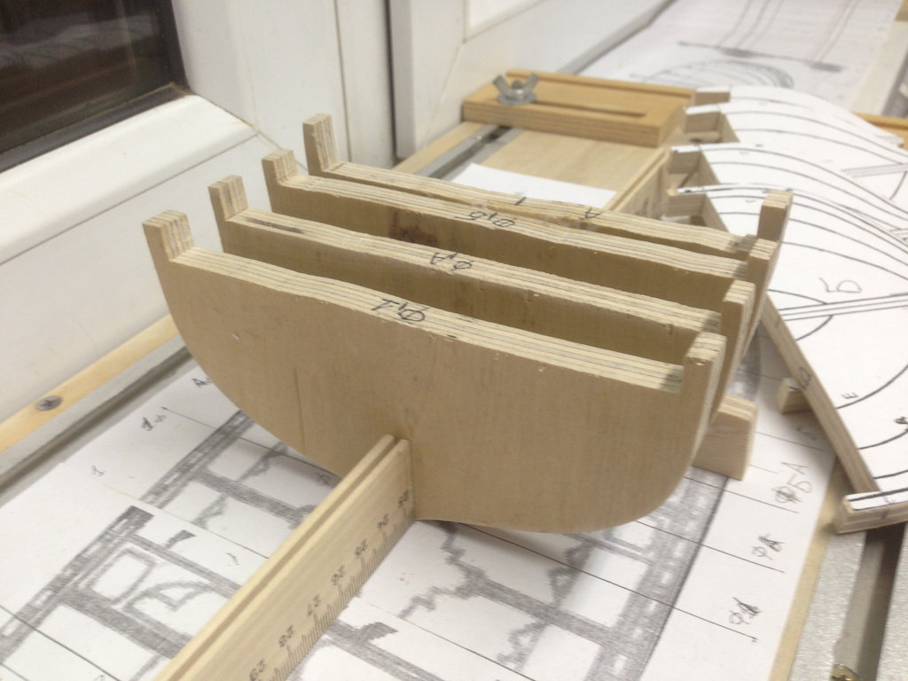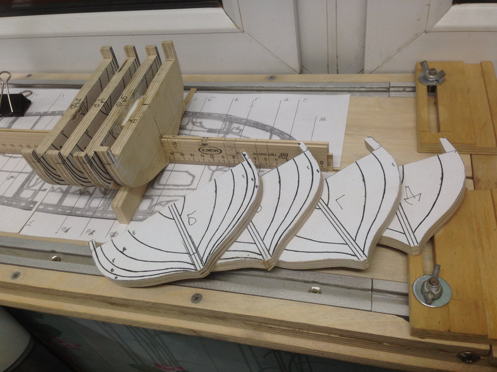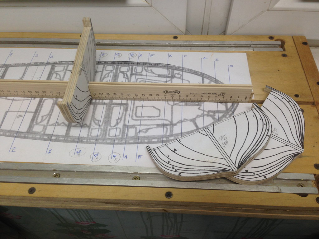 Всем привет ! Первые шпангоуты, первая примерка...... Но что то мне не нравиться мой стапель опять, походу повелась одна половинка продольная и нет на ней угла с фальшкилем (что из линеек) Ни как не могу придумать такое чтобы был универсальный многоразовый и удобный стапель....... Буду думать два дня пока на работе буду, надо будет опять переделать.....