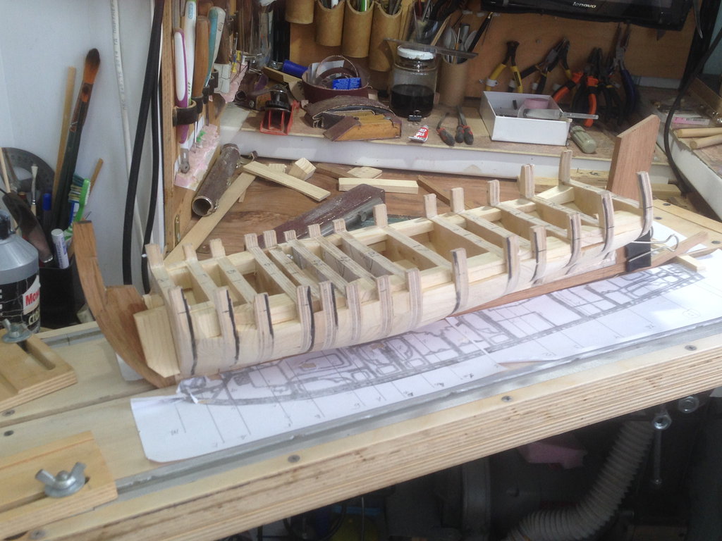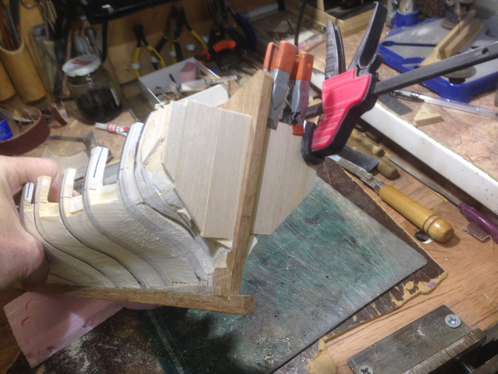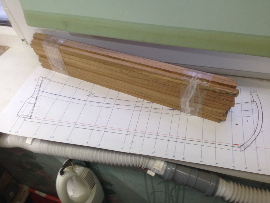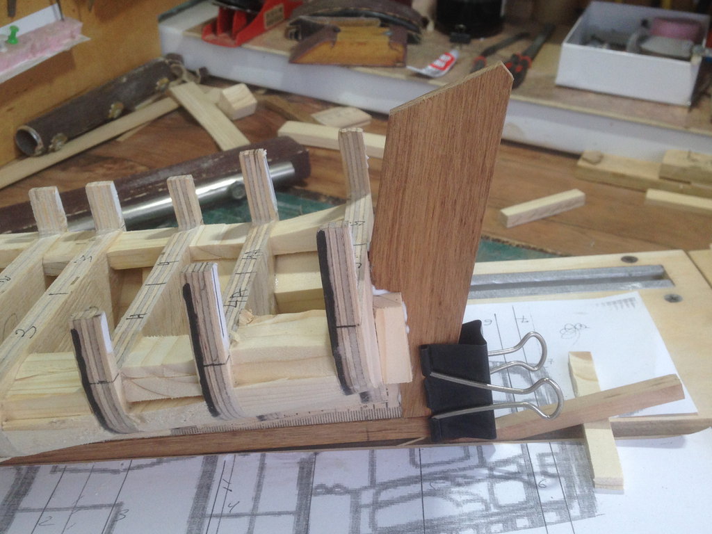 Всем привет ! Первые шпангоуты, первая примерка...... Но что то мне не нравиться мой стапель опять, походу повелась одна половинка продольная и нет на ней угла с фальшкилем (что из линеек) Ни как не могу придумать такое чтобы был универсальный многоразовый и удобный стапель....... Буду думать два дня пока на работе буду, надо будет опять переделать.....