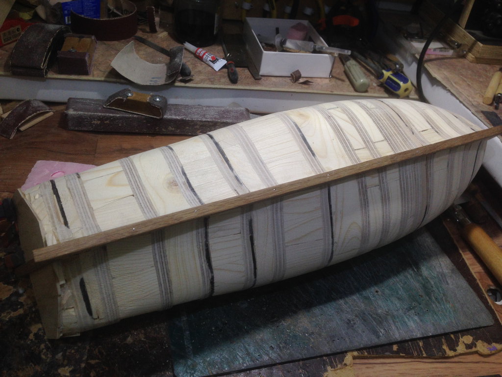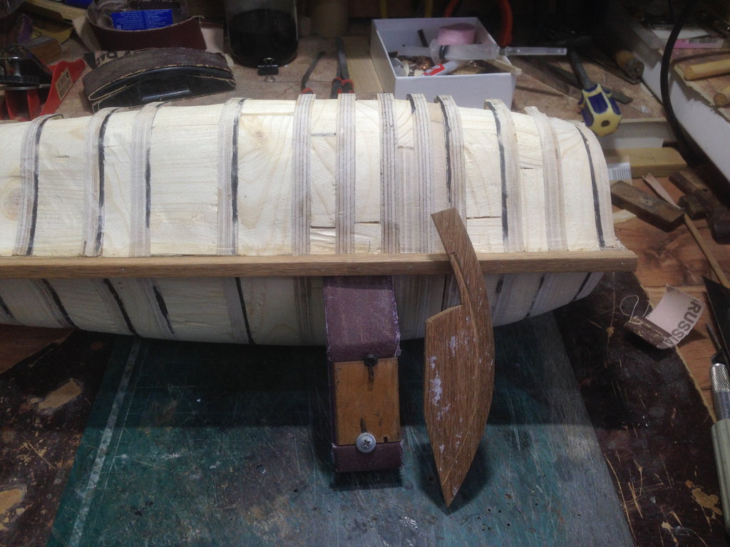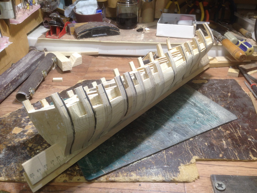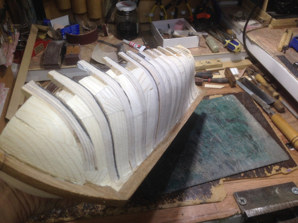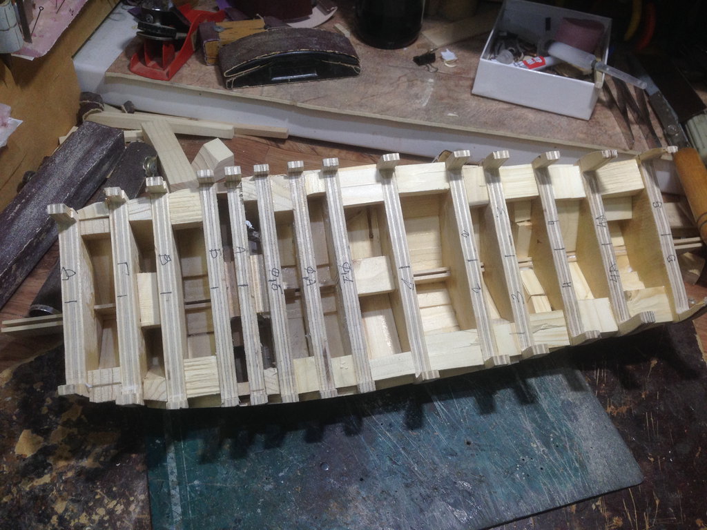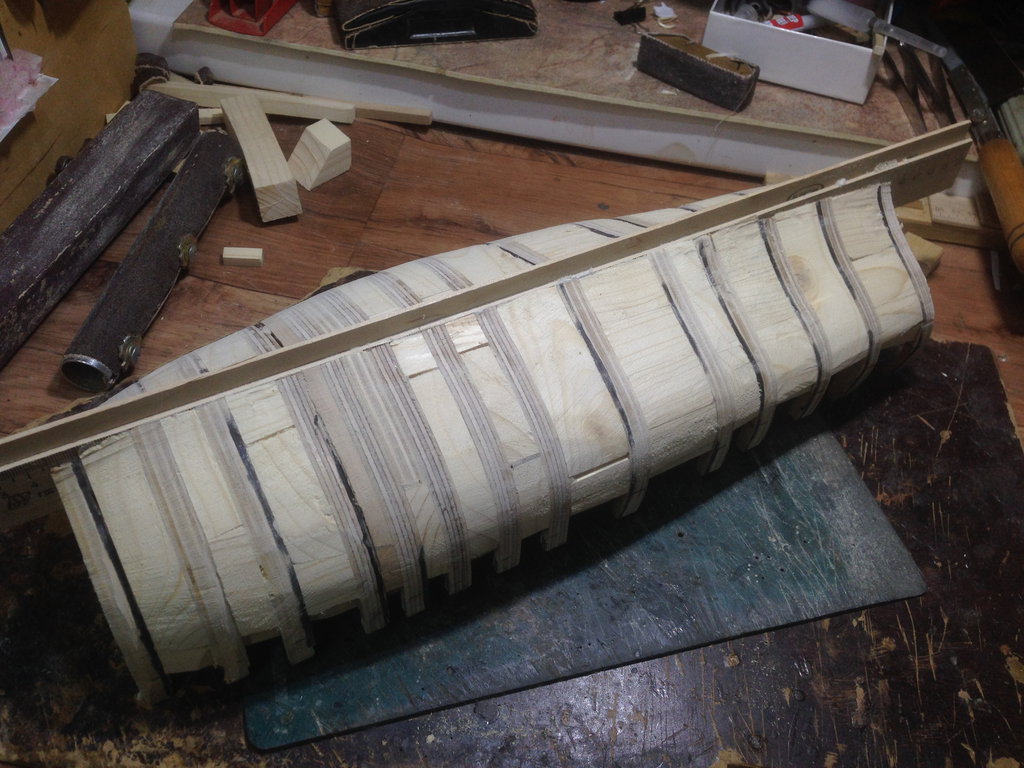 Всем привет ! Про шпангоуты, чем они толще тем жестче сразу конструкция, хотя при заполнении шпаций итог один - получается болван. У меня что было (фанера 10 мм) то и пользую. Про стапель - я забыл в прошлом сообщении написать. Я отшлифовал поверхность и все выровнял. Моя конструкция мне нравится - она получается универсальная , на нее можно много вешать всяких приспособ, но из практики, как правило , особо лишнего ничего не пригождается. Главное чтобы была ровная поверхность, и крепко модель крепилась.......