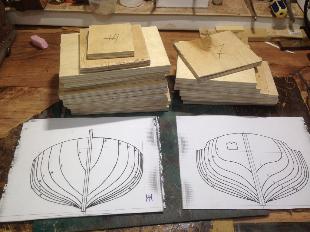 Насколько все получится как задумал не знаю, но буду пилить и стараться. Модель будет больше интерьерная, но с соблюдением всего чего положено........ Сегодня напилил фанерных заготовок для шпангоутов. Корпус будет болван, без внутрянки...... Есть небольшая проблема с распиловкой. Разобрал в глубокую модернизацию большую и среднюю циркулярки ( Ютуба насмотрелся.....