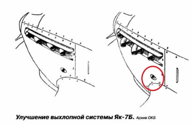 Учитывая, что прототип относится к декабрю 1942-го года, то патрубки могли бы быть позднего типа. Так как с августа начали выпускать Як-7Б с двигателем М-105 ПФ. Следовательно, могли присутствовать и остальные признаки поздних выпусков. Новый двигатель (М-105 ПФ) начали устанавливать с 22-й серии на заводе №153, испытания проводились с июля по сентябрь. Однако, не понятно когда начался выпуск 32-й серии, с которой начались визуальные перемены - вероятно, уже в 1943-м.