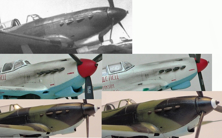 Учитывая, что на фото на заднем плане самолеты с явно старым типом патрубков, то можно предположить, что наш прототип имеет все признаки ранних серий Як-7Б.