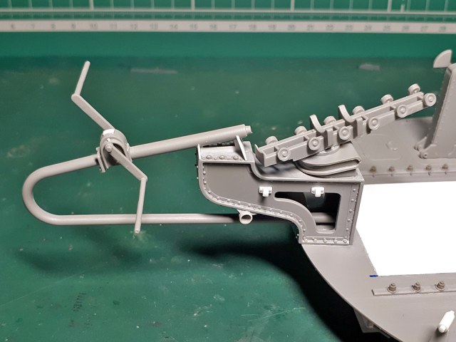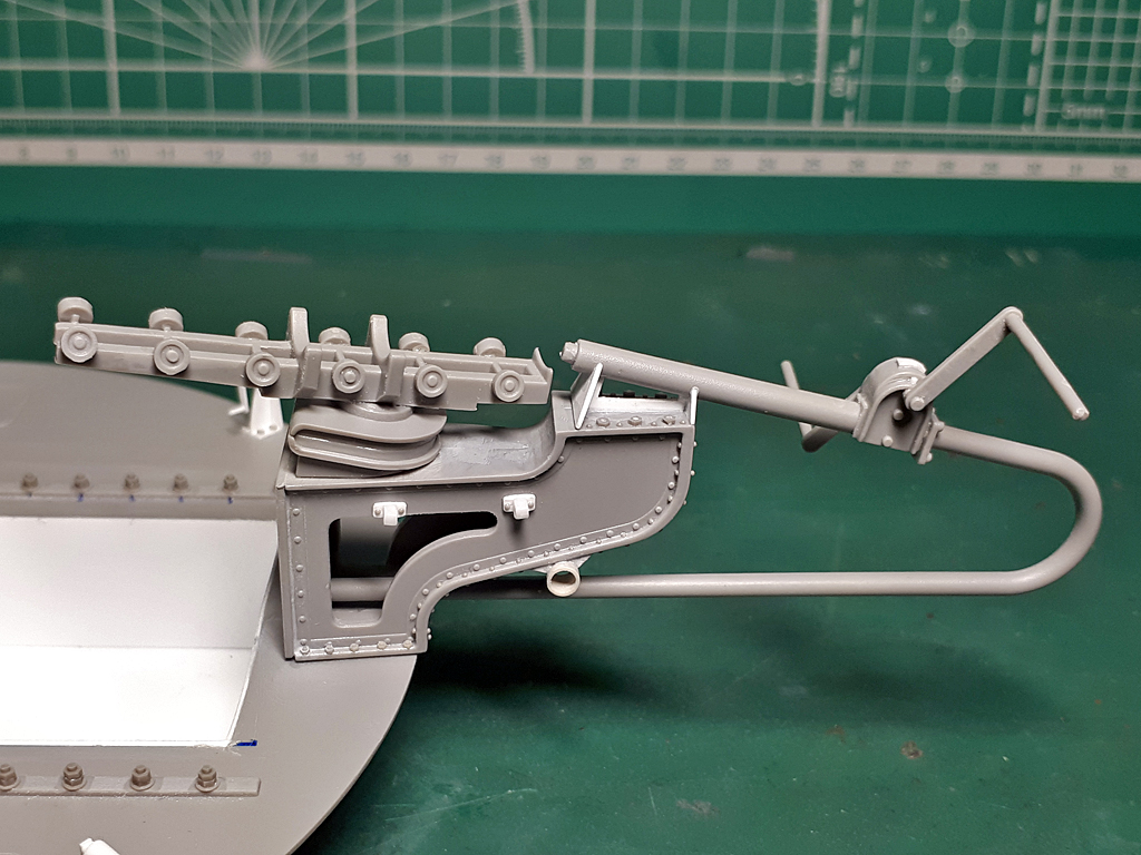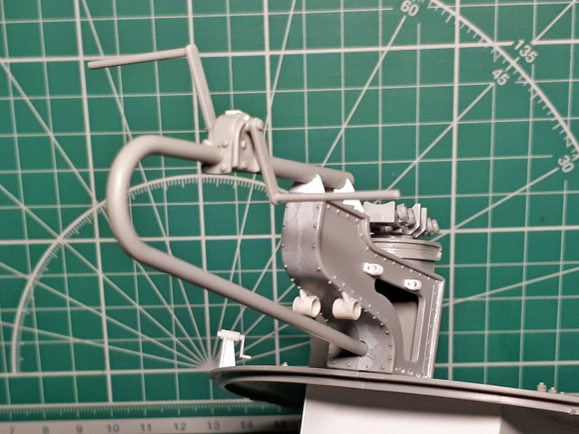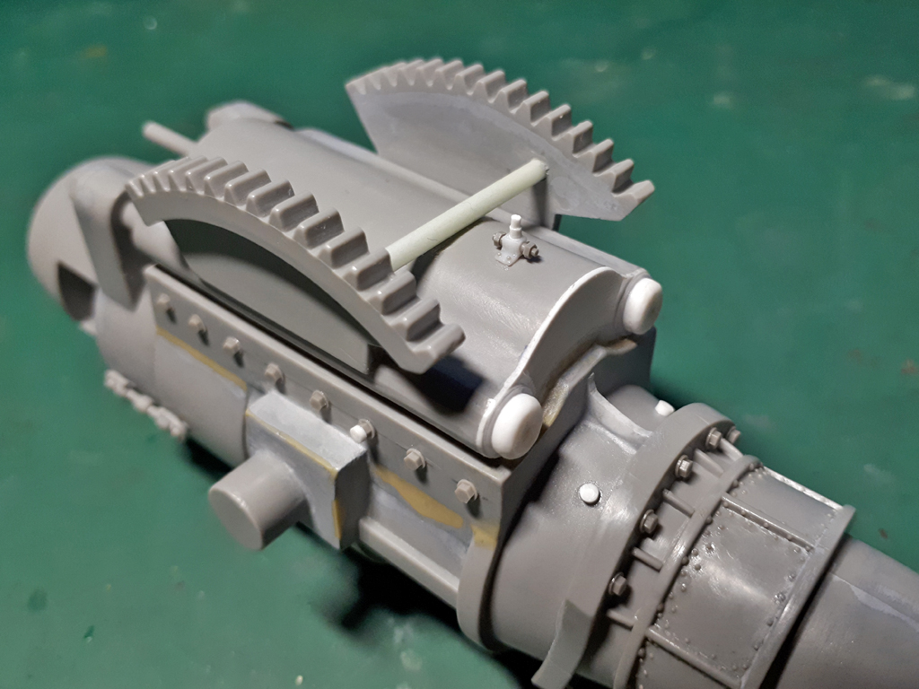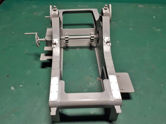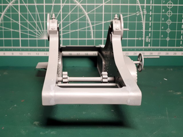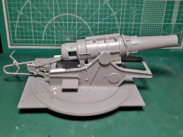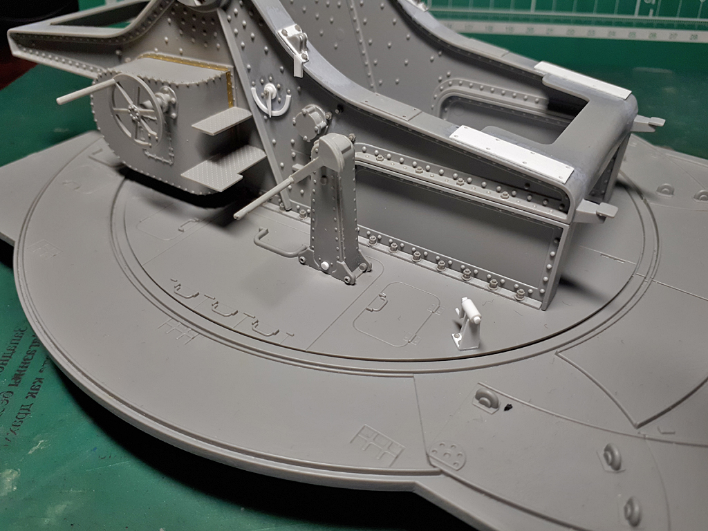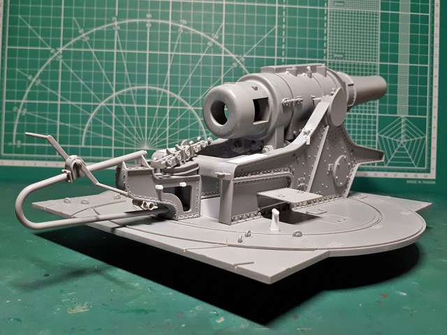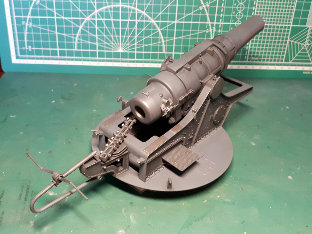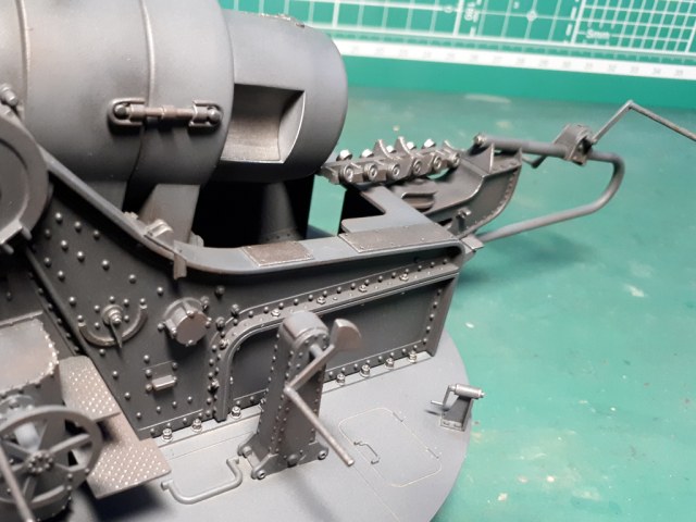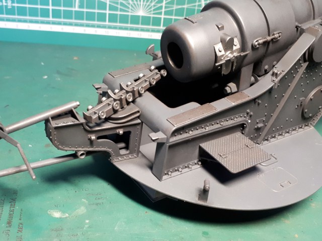 Кроме того, на платформе, в ее задней части, рядом с рельсами, симметрично продольной оси орудия, стоят два набольших механизма с рукоятками, назначение которых мне неизвестно. В наборе их нет. Попробую сделать )