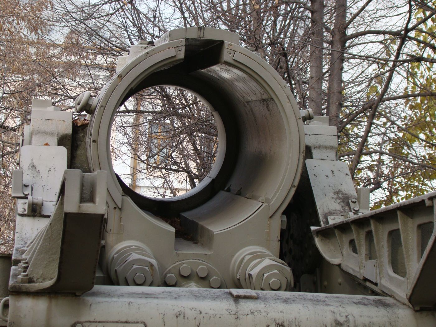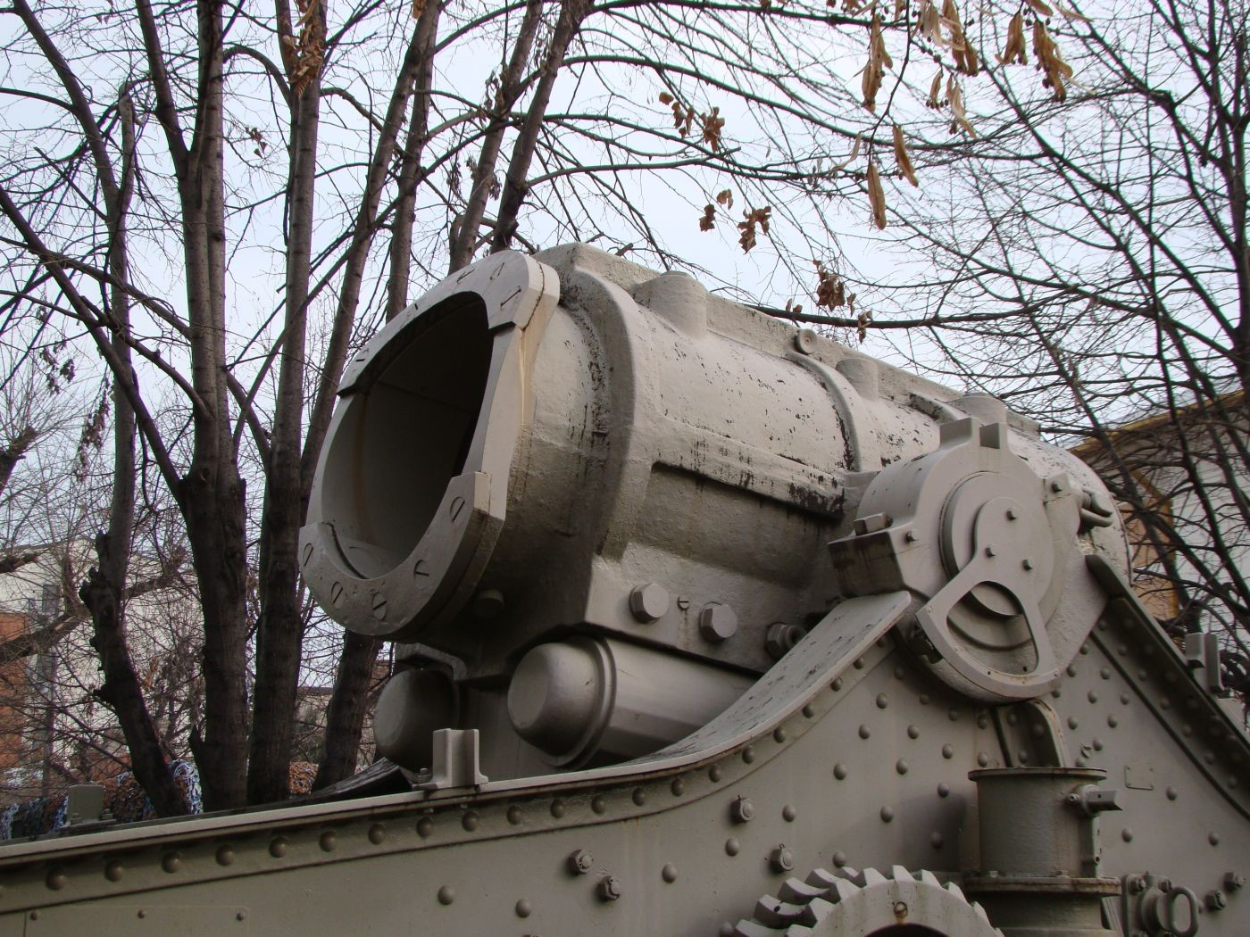 На фотографиях орудия, которые мне удалось найти, оно либо окрашено в серый цвет, либо несет вот такой невзрачный камуфляж: