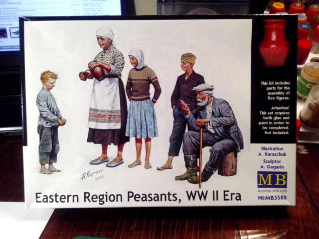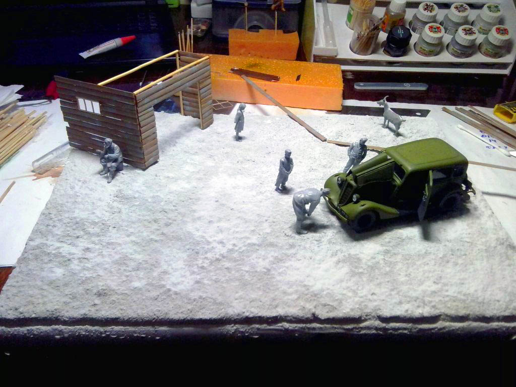 Пока нет ощущения деревенского двора. Я бы начал строить композицию примерно решив. какой антураж будете делать. Сейчас диорама выглядит неправомерно большой и пустоватой. На такую площадь просится и телега и дрова и колодец и возможно много чего, чтобы заполнить пространство. И объедините действующих лиц одним главным действием - смотреть на эмку. Кину вам для примера фотки возможных решений двора, Погуглите. Найдите,что понравится сами.