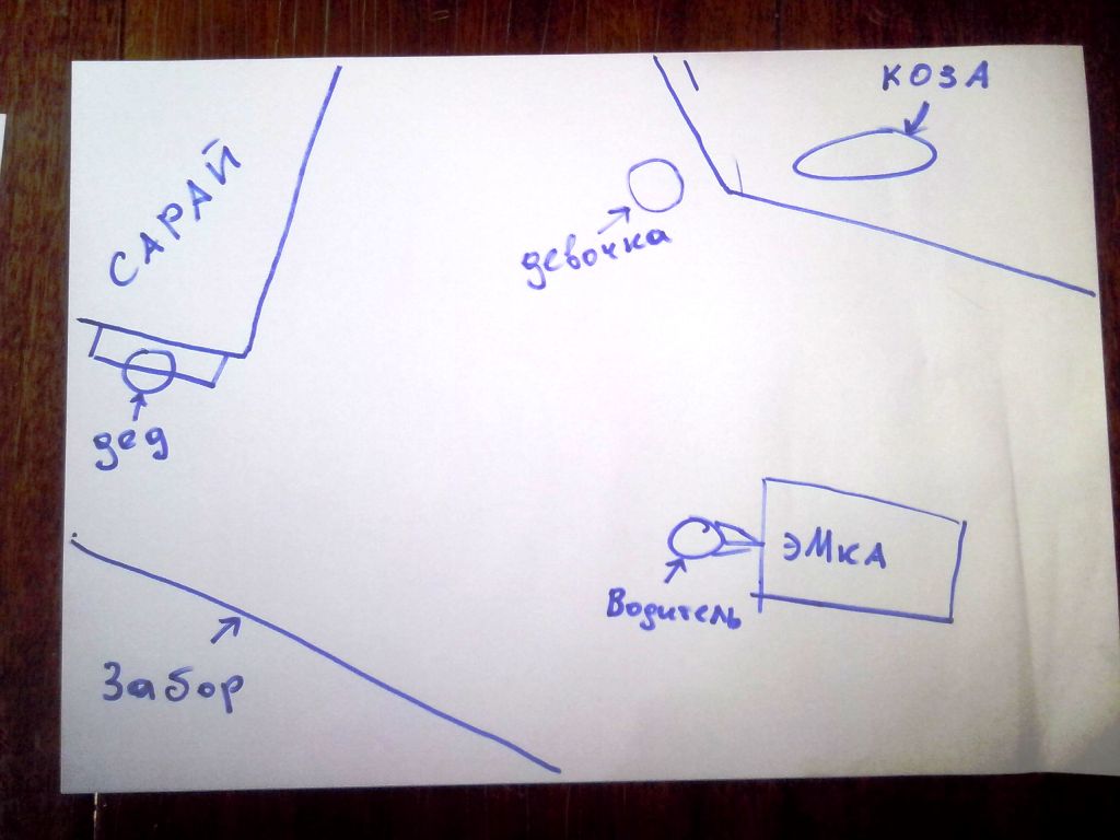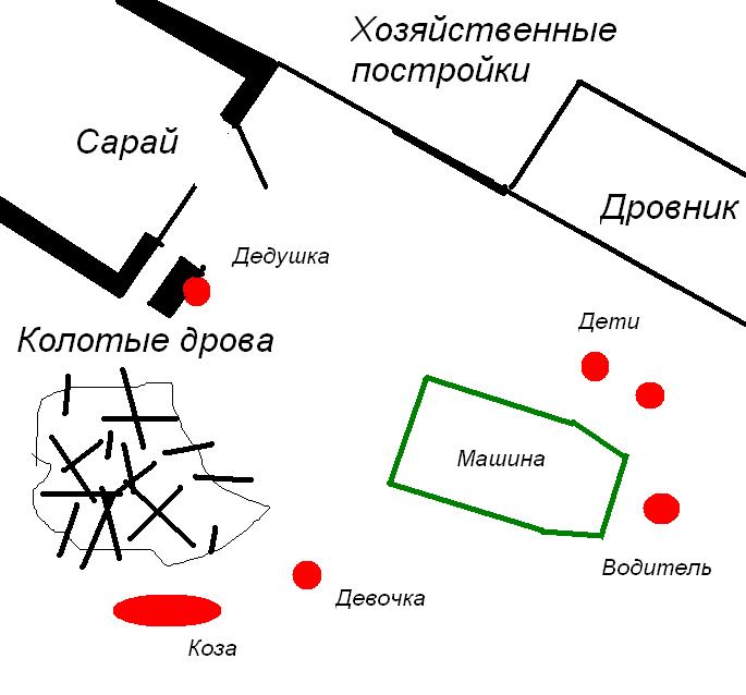 А где будет задний план, где передний? Забор, сарай и деда надо пустить на заднем плане. Козу и девочку напротив вынести на передний. Машину ближе к центру Пацанов у машины скучковать.