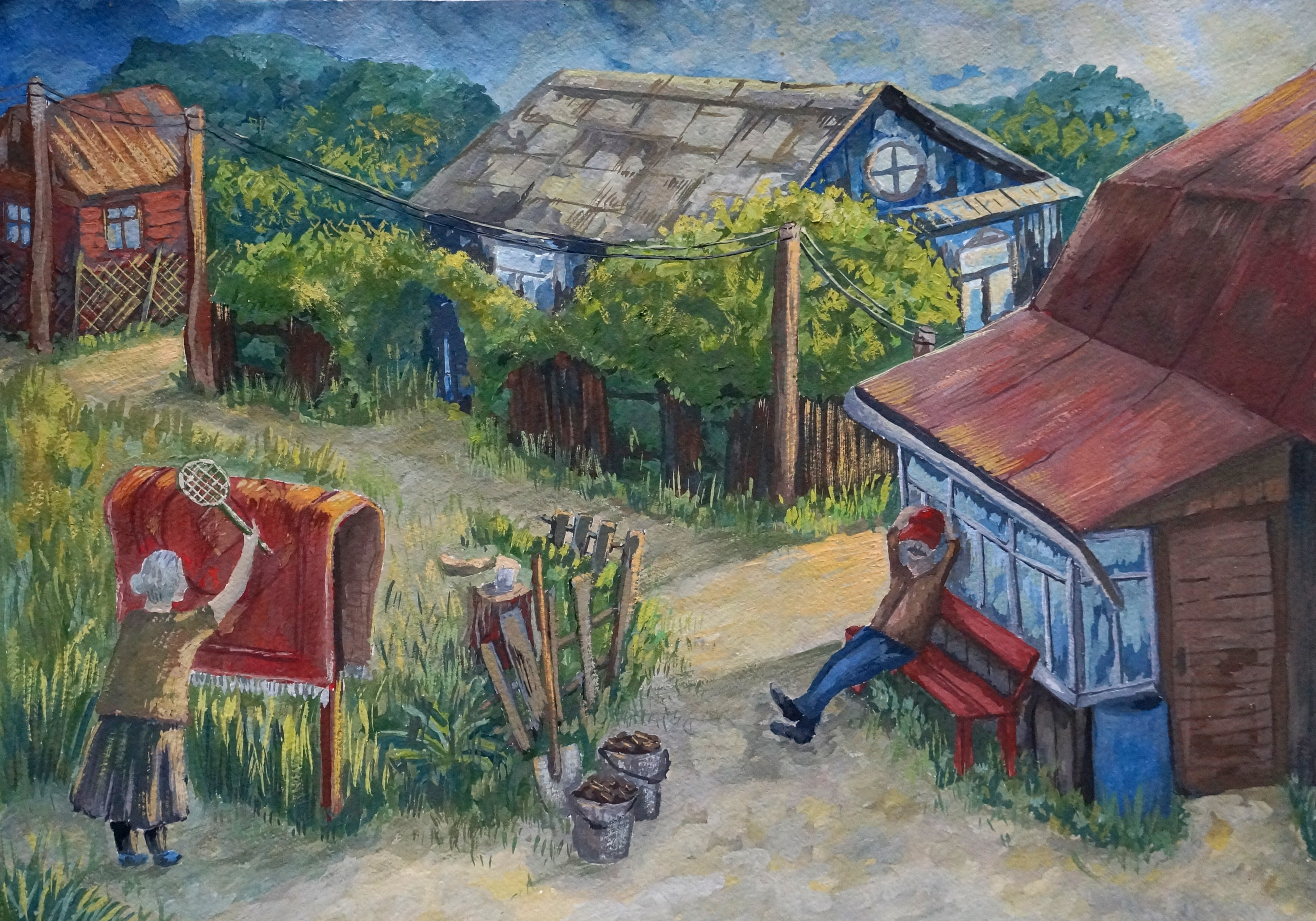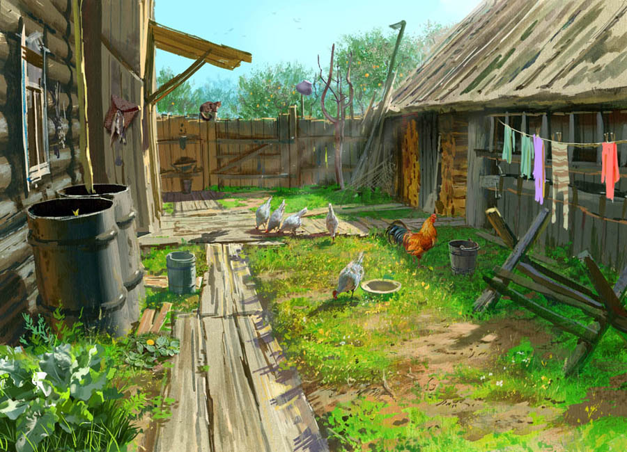 Успехов! А репродукции деревенских дворов должны помочь в достоверности и реалистичности всей картины.