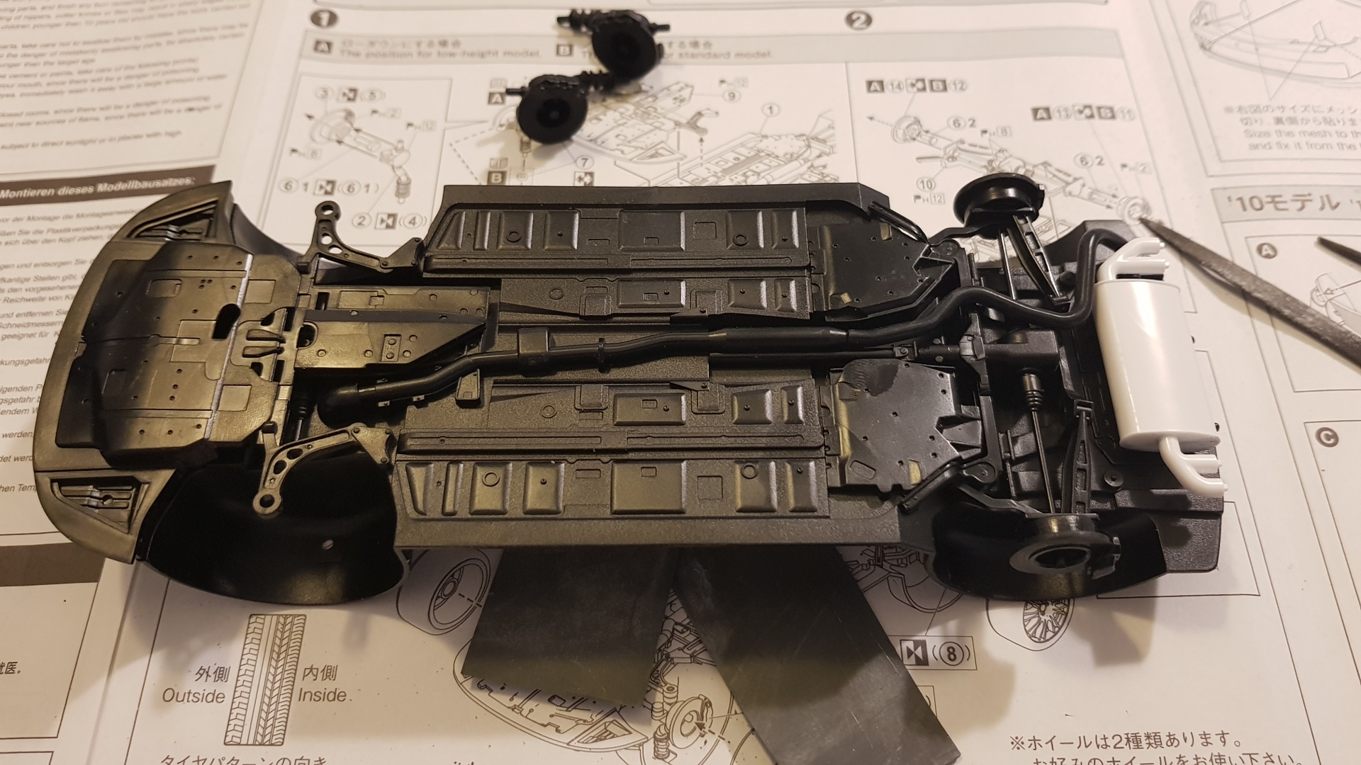 До этого сталкивался только со старыми наборами FUJIMI и наборами REVELL ("италовские" грузовики не в счет). Здесь, конечно, совсем другой уровень, очень высокое качество литья, проработана подвеска, закрыты колесные ниши, проработанный интерьер. В комплекте даются детали как для 2007, так и 2010 года выпуска (пока не изучал, не скажу точно, чем они отличались). Также можно сделать подвеску в двух вариантах - заниженном и нормальном.