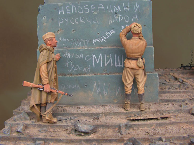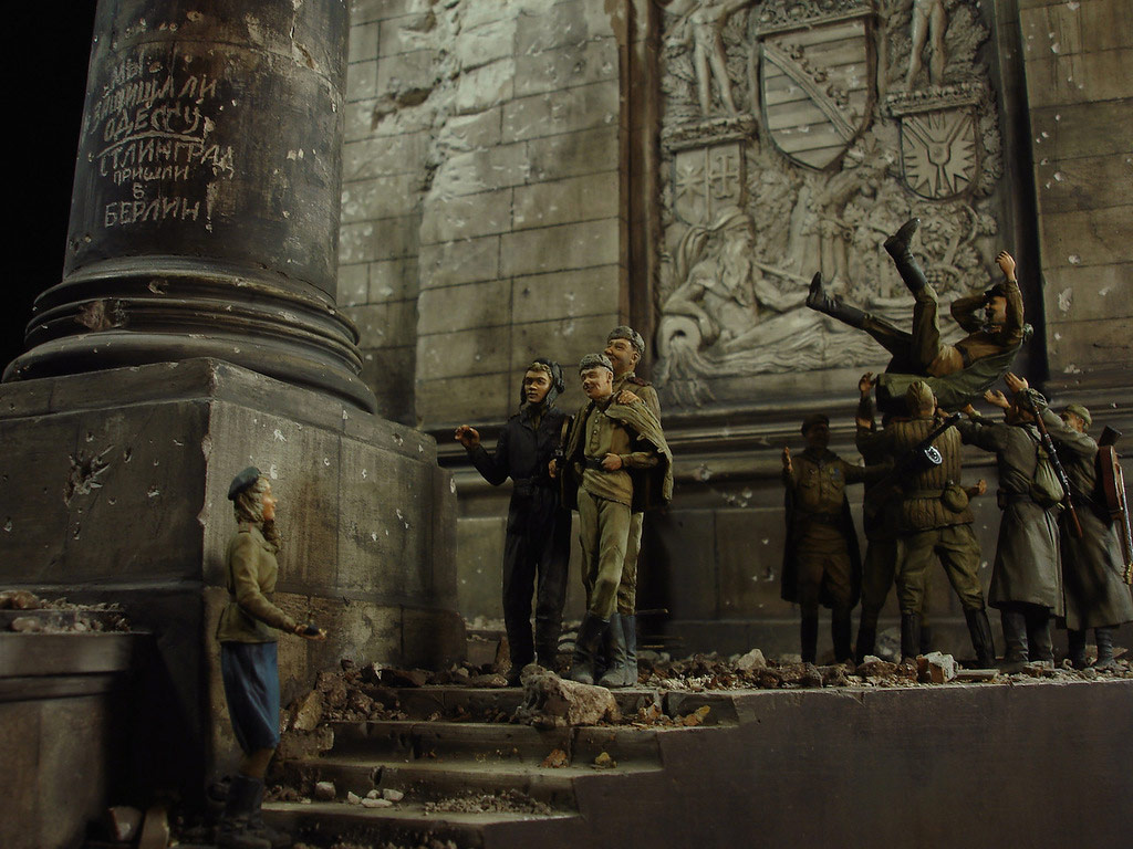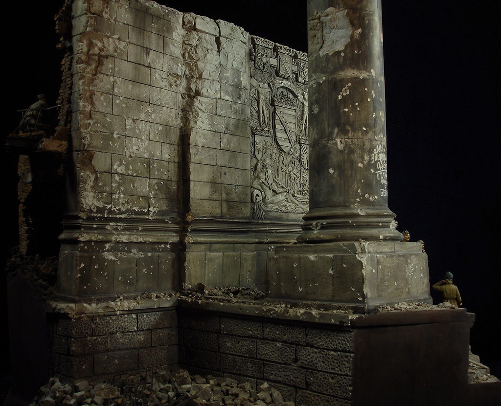 В основу положена смоляная заготовка колонны и ступенией Рейхстага - переливка фирмы Ягуар (серая вставка). Показалось, что маловато. Расширил до двух колонн. Ступеньки - пластик. Вторая колонна отлита по первой через силиконовую форму. Фигурки - Драгон, Звезда. Ждите обновлений.