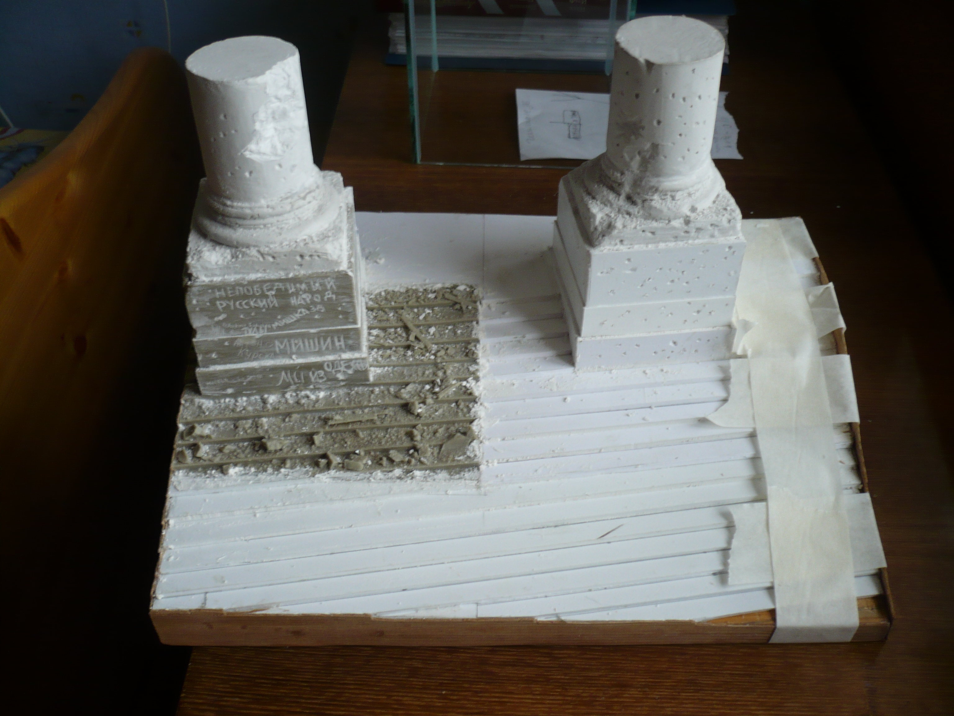 На смоляном постаменте набора они уже были нанесены. И фигурки в наборе есть. Сначала хотел сделать также. Потом захотелось расширить основание, сделать вторую колонну. Устроить штурм. Был момент, когда были мысли сделать диораму условно составной: у одной колонны события после штурма с надписями, а у другой - до штурма, без надписей. Потом передумал. Ералаш какой-то получится. Ни то ни се. Следовательно надписи придется замазать.