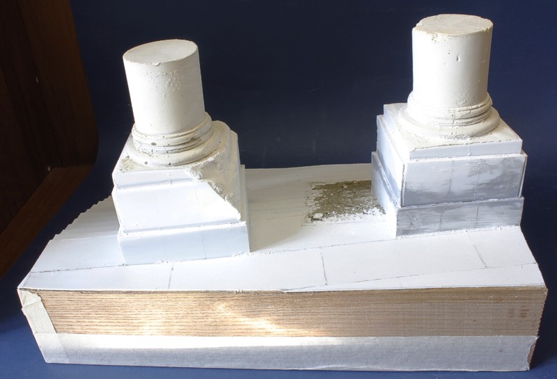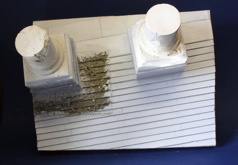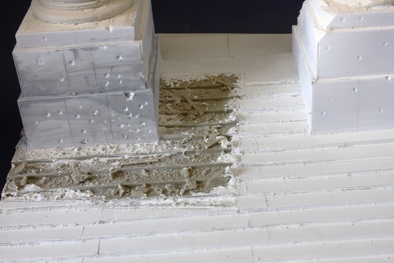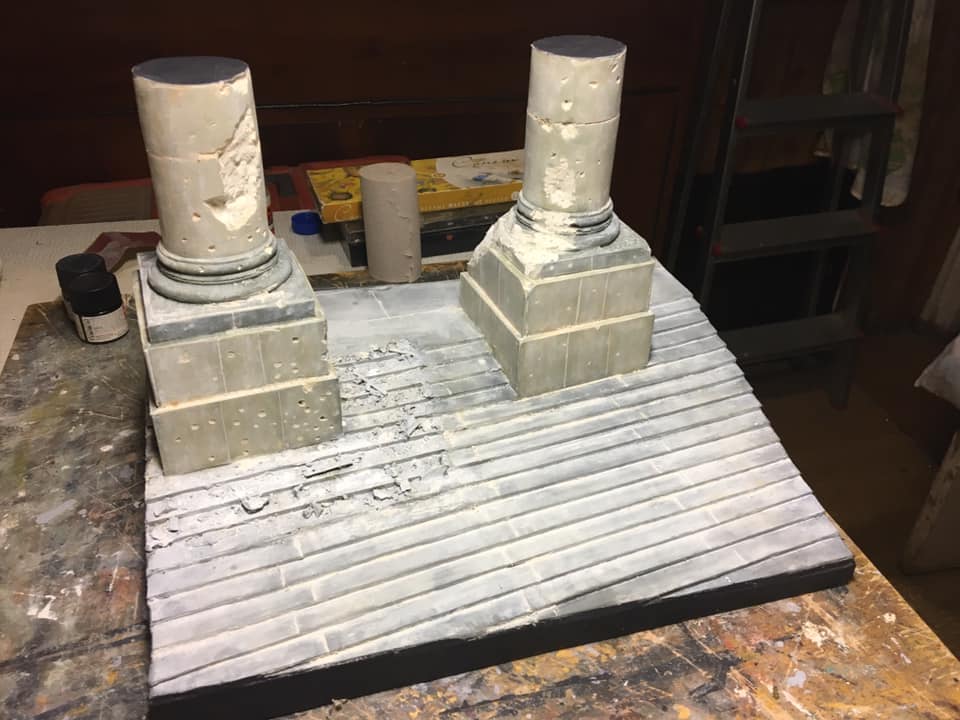 Практически доделал конструкцию основания, выровнял ступеньки, нанес основные повреждения. Завтра сфоткаю. Обратил внимание, насколько неравномерно стреляли. Одна тумба изрешечена. Второй досталось значительно меньше.