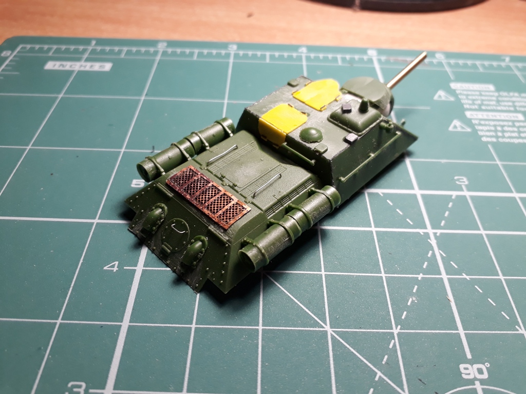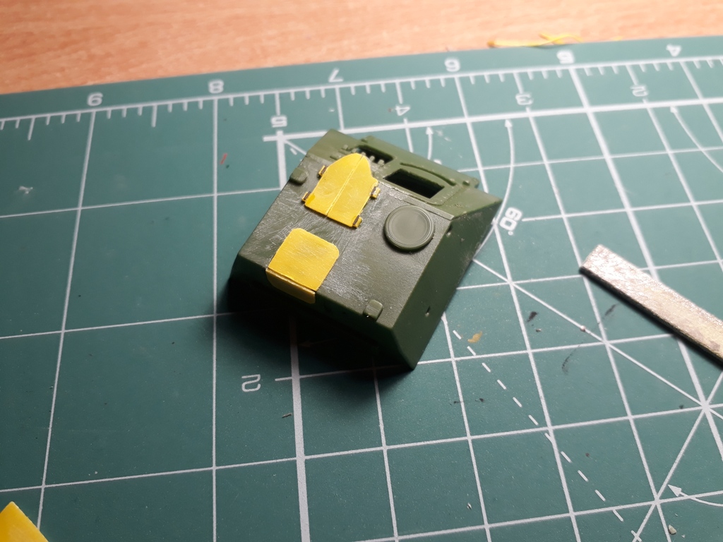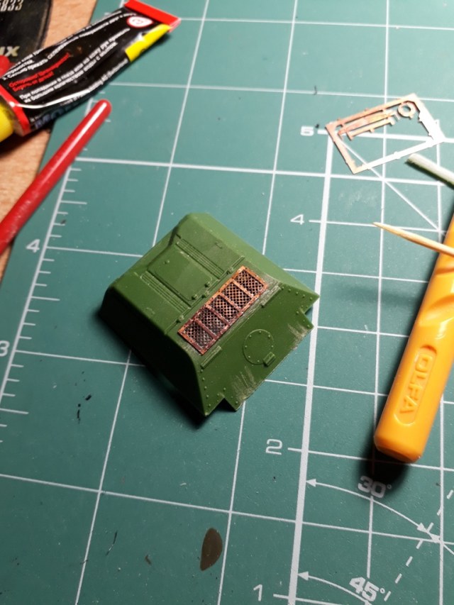 Посидел, подумал. Жаль стало использовать его на опытной САУ. Оставлю лучше на какой-нибудь боевой вариант. Времени было мало. Однако лепить травление решетки как предлагает UM показалось варварством. Путем нехитрых манипуляций вырезал под решетку отверстие.