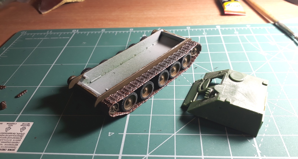 Когда приклеил надгусеничные полки (непонятно зачем члененные конструкторами UM на две части каждое) и собрался уже грунтовать, обнаружил что на всех архивных фото на правой надгусеничной полке имеется ящик. Он меньше того что есть на левой стороне. Решил тоже сделать.